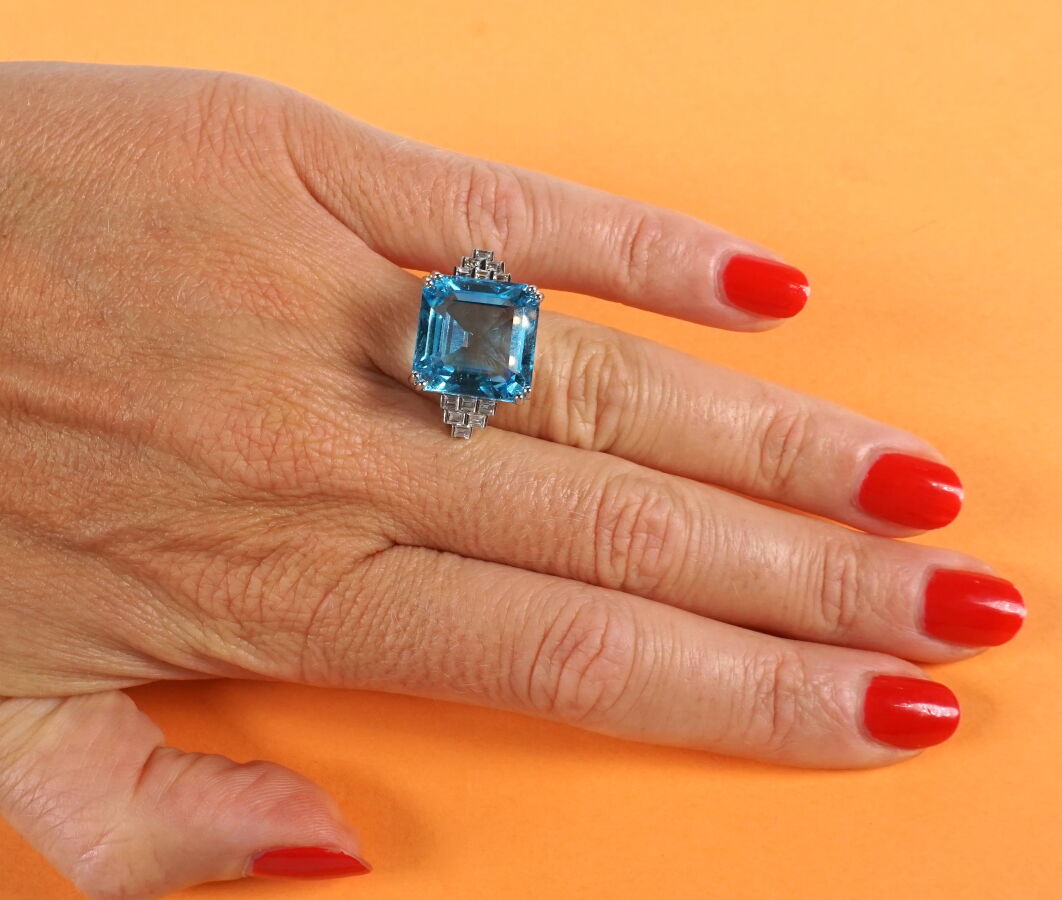 Bague "Cocktail" en or blanc 18K (750/oo), sertie d'une topaze bleue (swiss blue) taille radian calibrant 21.20 cts, épaulée de 2x6 diamants blancs taille baguette disposés en triangle et calibrant ensemble 0.35 ct. TDD 53.5. Poids brut : 11.7 g environ.