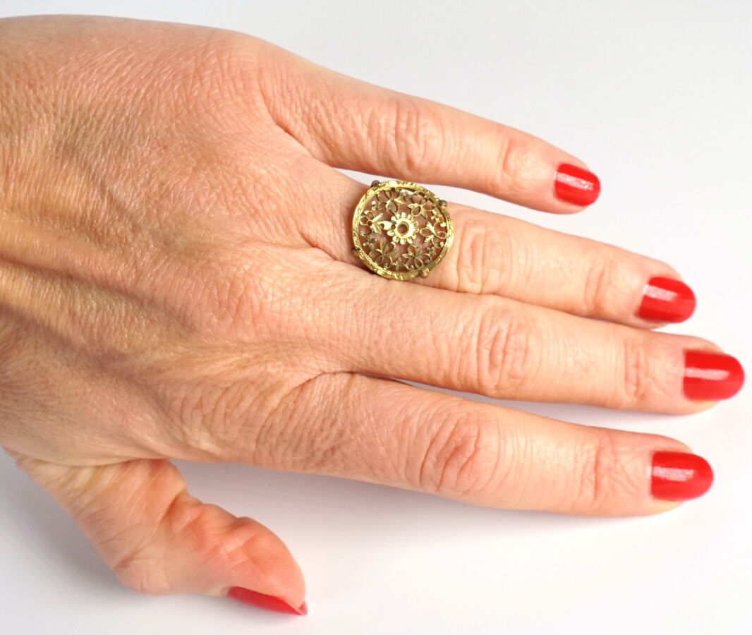 Bague "Coq" en métal, le plateau formé par un coq de montre à décor de rinceaux feuillagés, D. 1.9 cm. TDD 57.5.