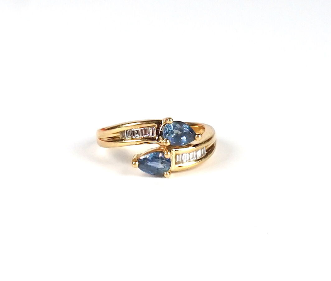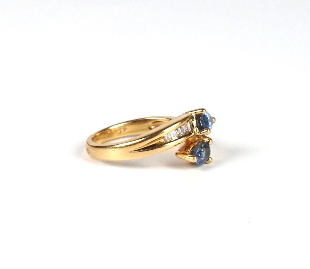 Bague "Croisée" en or jaune 18K (750/oo), sertie de 2 pierres bleues taille poire, probablement des spinelles ou des saphirs, épaulés de diamants taille baguette disposés en chute. TDD 54. Poids brut : 5.4 g environ.
