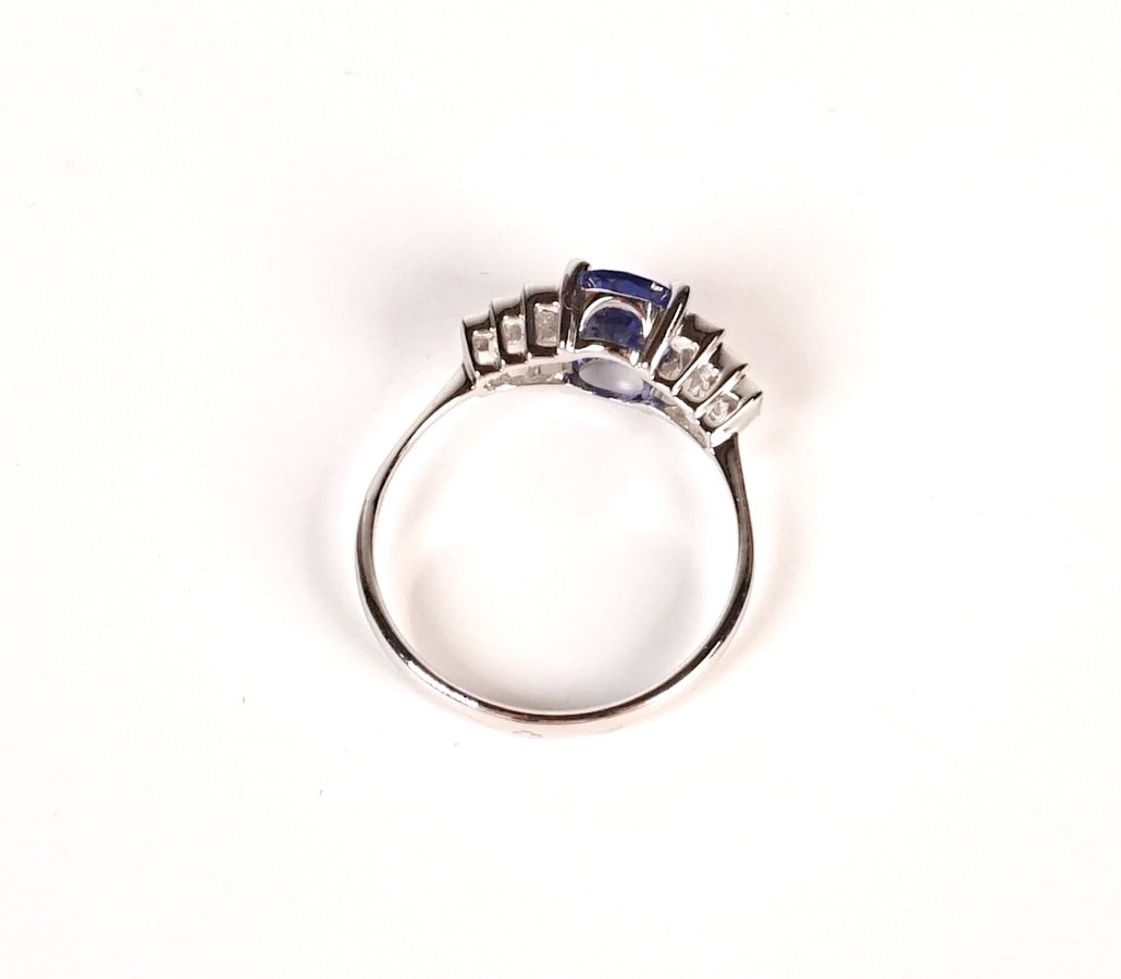 Bague de style Art-Déco en or blanc 18 K (750/oo) sertie d'un saphir taille ovale pesant 1.4 ct, épaulé de 6 diamants blancs taille baguette disposés en chute, pesant ensemble 0.25 ct. TDD 54. Poids brut : 2.4 g environ.