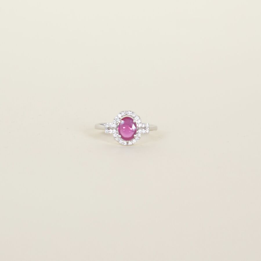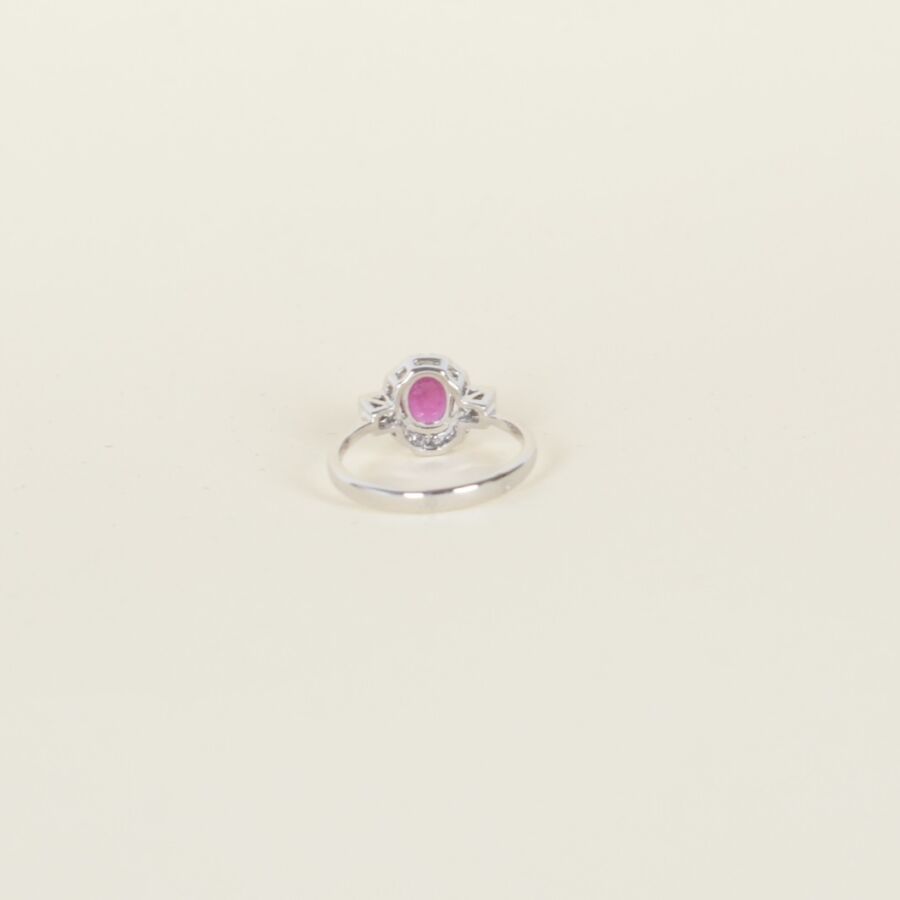 Bague de style "Art déco" en or blanc 18K (750/oo) centrée d'un rubis taille ovale calibrant 0.7 ct dans un entourage de vingt huit diamants blancs taille moderne pour environ 0.1 ct, TDD : 52.5, Diam. Tête de bague : 10 x 12 mm, Poids brut : 2.7 g.
