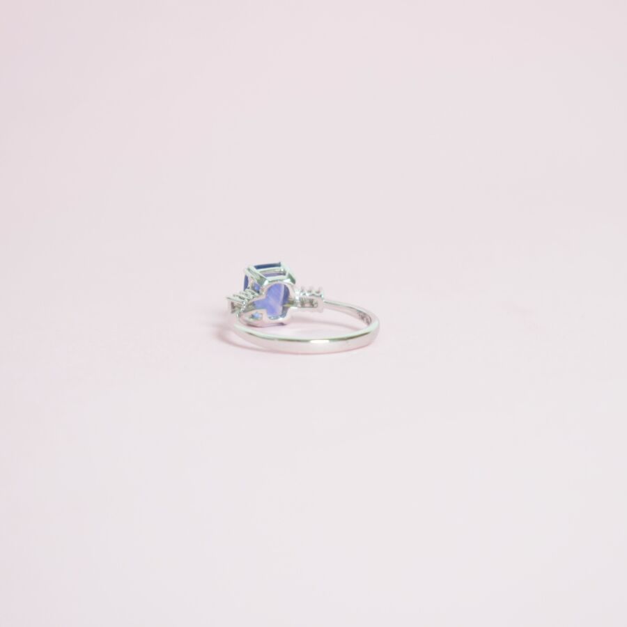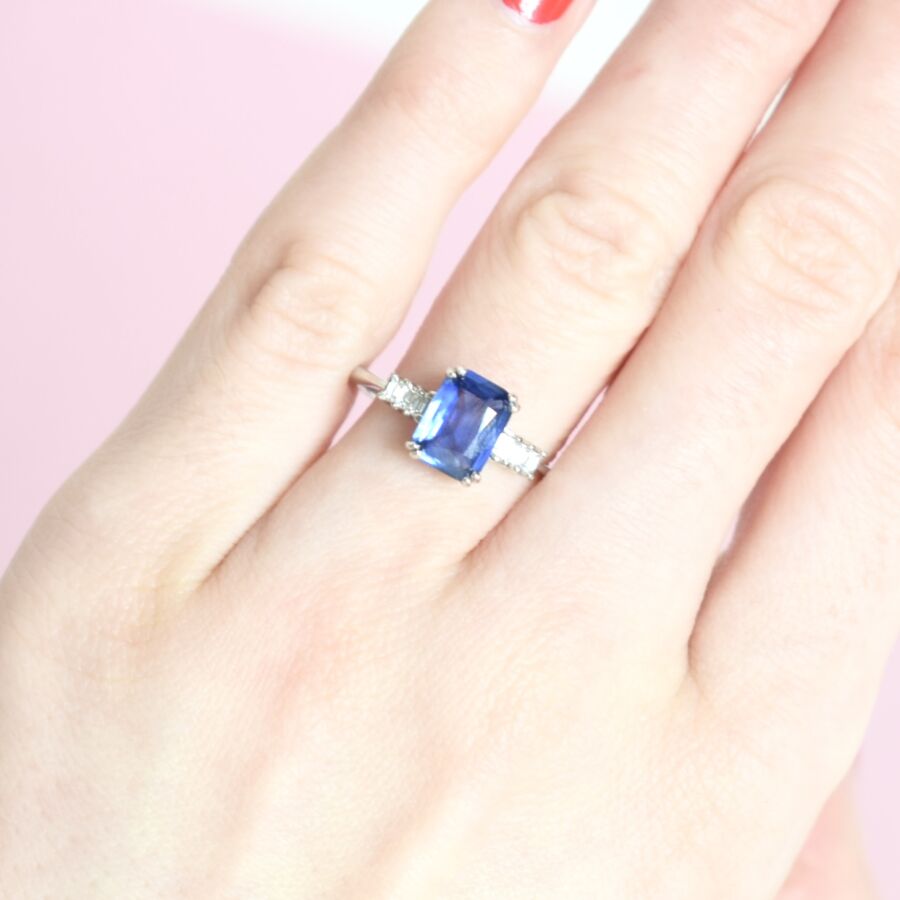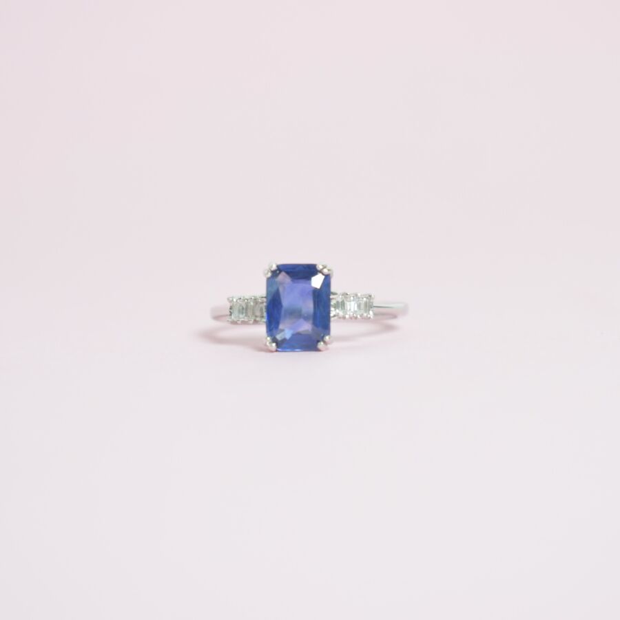 Bague de style "Art Déco" en or blanc 18K (750/oo), sertie d'un saphir probablement Ceylan taille émeraude pour 1.4 ct environ retenu par un serti quatre doubles griffes, épaulée de six diamants taille baguette pour 0.05 ct environ, Dim. Tête de bague : 8 x 13 mm, TDD : 53, Poids brut : 2.5 g environ.