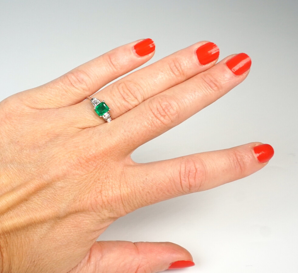 Bague de style Art-Déco en or blanc 18K (750/oo) sertie d'une émeraude taille émeraude 0.70 ct épaulé de 6 diamants blancs taille baguette 0.20 ct en chute. TDD 54. Poids brut : 2.3 g environ.