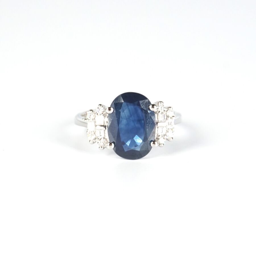 Bague de style Art Déco en or gris 18K (750/oo) sertie d'un saphir bleu de taille ovale calibrant 3.22 ct environ et épaulé de 2x3 diamants taille baguette et de 2x4 diamants taille moderne calibrant ensemble 0.20 ct environ, TDD. 54. Poids brut : 4 g environ.