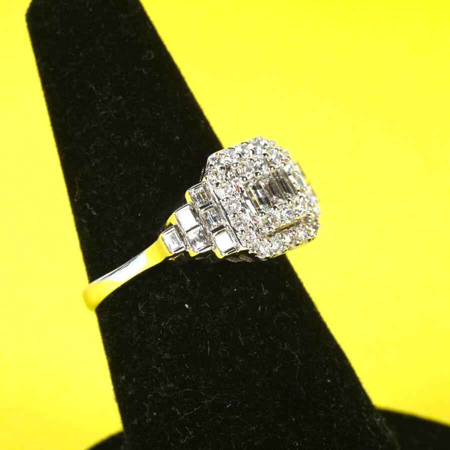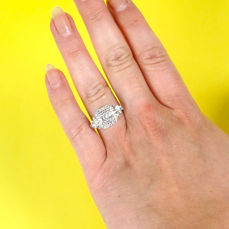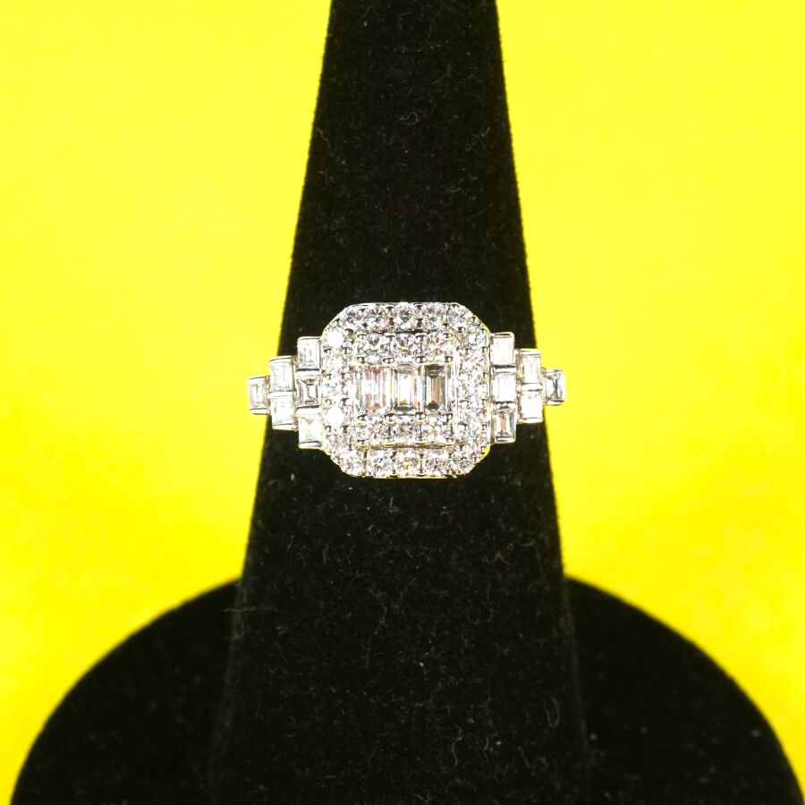 Bague de style Art Déco en or gris 18K (750/oo) sertie au centre de 3 diamants taille baguette et 26 diamants taille moderne, les montants sertis de 2x6 diamants taille baguette, pour un total calibrant de 1 ct, TDD : 55. Poids brut : 4 g environ.