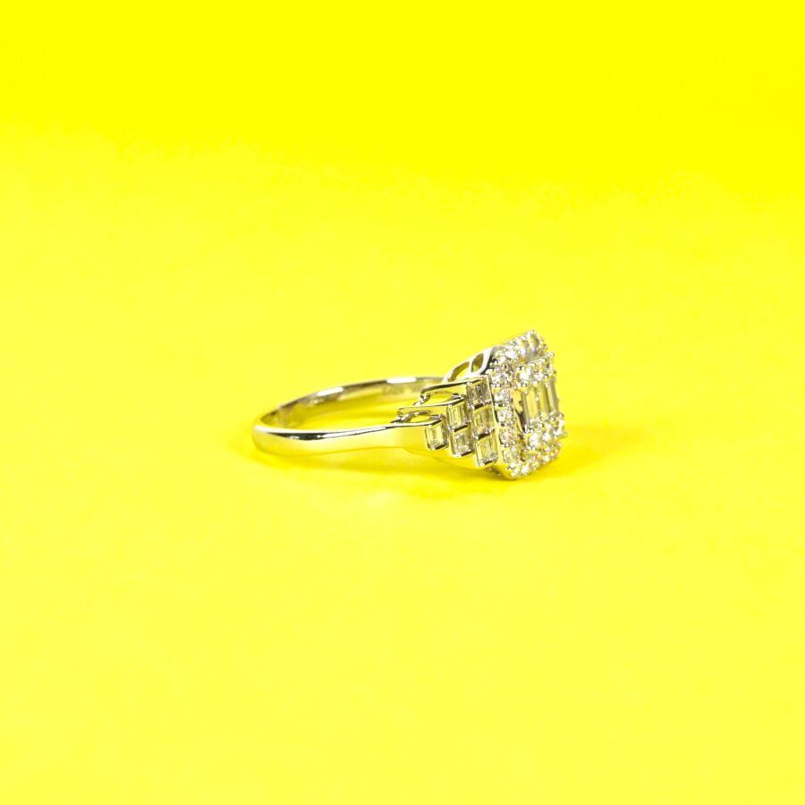 Bague de style Art Déco en or gris 18K (750/oo) sertie au centre de 3 diamants taille baguette et 26 diamants taille moderne, les montants sertis de 2x6 diamants taille baguette, pour un total calibrant de 1 ct, TDD : 55. Poids brut : 4 g environ.