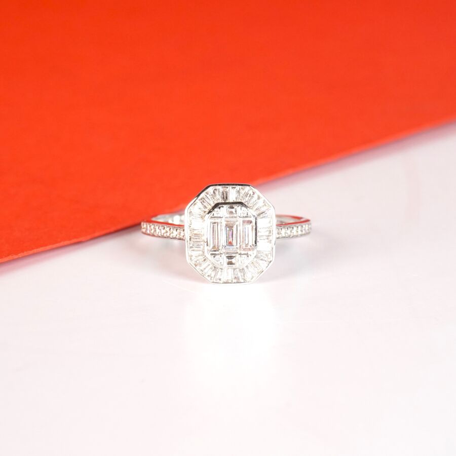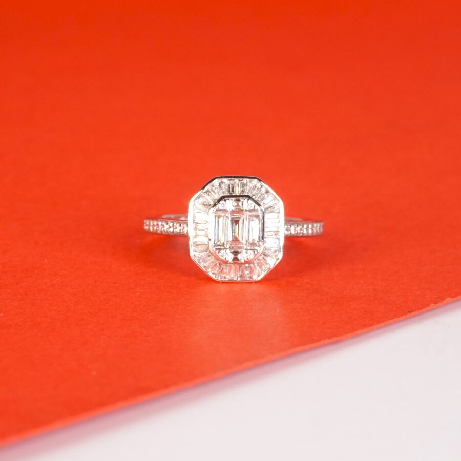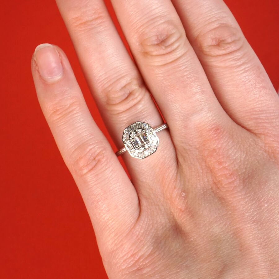 Bague de style "Art déco" en or gris 18K (750/oo), sertie en son centre de 37 diamants blancs taille baguette et tapers calibrant ensemble 0.60 ct environ et épaulés de 22 diamants blancs taille moderne calibrant au total 0.10 ct environ, TDD : 54/54.5. Dim. Tête de bague : 11 x 20 mm. Poids brut : 2.1 g environ.