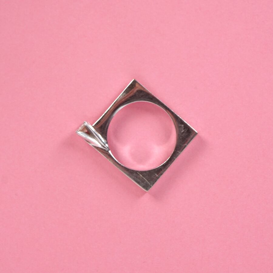 Bague de style moderniste en or gris 18K (750/oo), l'anneau de forme carrée sertie sur un côté d'un petit diamant taille moderne calibrant 0.1 carat environ. TDD 48. Poids brut : 3.6 g environ.
