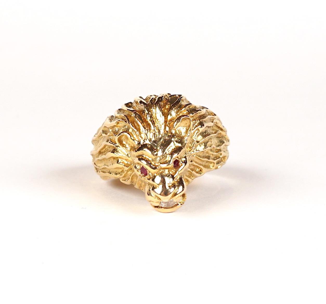 Bague d'homme "Lion" en or jaune 18 K (750/oo), l'animal retenant un diamant entre ses crocs, les yeux ornés de petits rubis. TDD 65. Poids brut : 32 g environ.