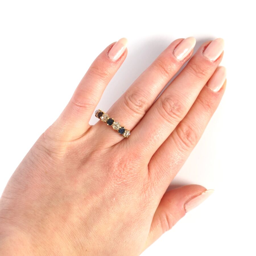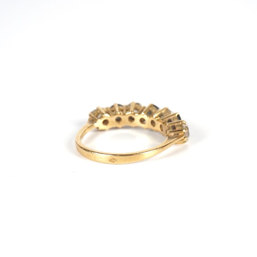 Bague dite jarretière en or jaune 18K (750/oo), ornée de 7 pierres alternant 4 diamants taille ancienne et 3 pierres bleues, probablement des saphirs, calibrant 0.2 ct chaque environ, TDD. 55. Poids brut : 3.7 g environ.