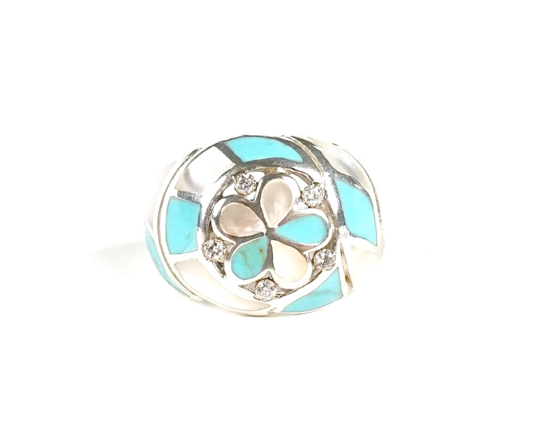 Bague "Dôme" en argent (925/oo) et or gris 14K (585/oo) entièrement sertie de nacre naturelle et bleutée, le centre partiellement ajouré accueillant une rosace agrémentée de 5 petits diamants ronds taille moderne. TDD 53. Poids brut : 12.7 g environ.