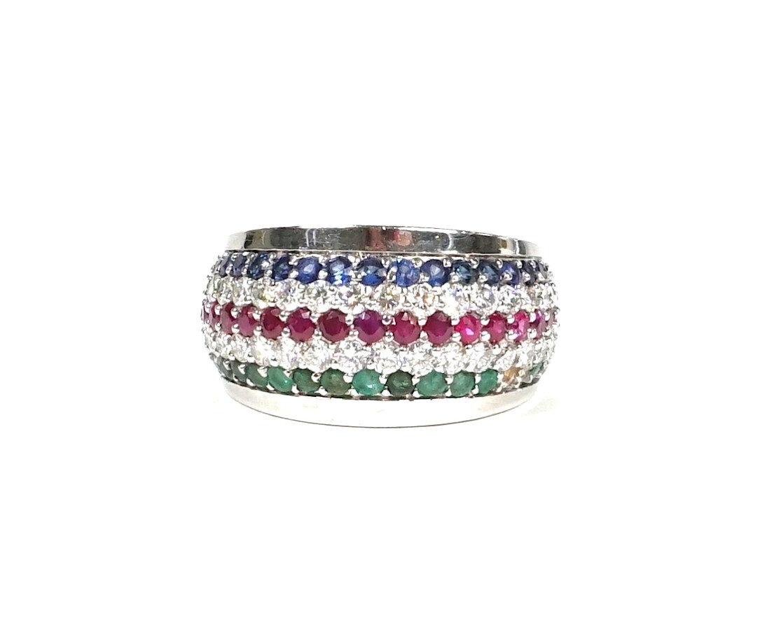 Bague "Dôme" en or gris 18K (750/oo) agrémentée d'une ligne de saphirs, de rubis et d'émeraudes taille ronde, calibrant ensemble 1.8 cts environ, alternées de 2 lignes de diamants ronds taille moderne calibrant ensemble 1.5 cts environ, Lar. du bandeau : 1.5 cm (manquent 2 émeraudes et un rubis). TDD 55. Poids brut : 16.8 g environ.