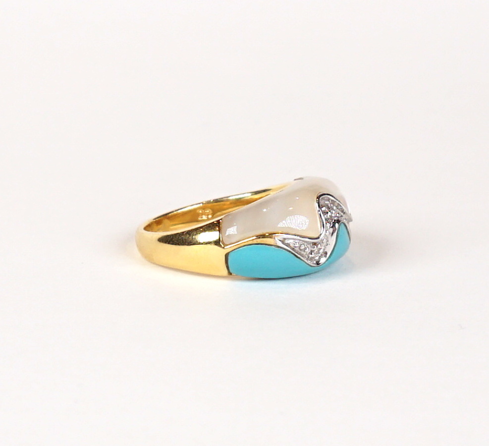 Bague "Dôme" en or jaune 18 K (750/oo) sertie de turquoise et de nacre, agrémentée d'une ligne sinueuse de diamants de 0.05 ct. TDD 53.5. Poids brut : 7.15 g environ.