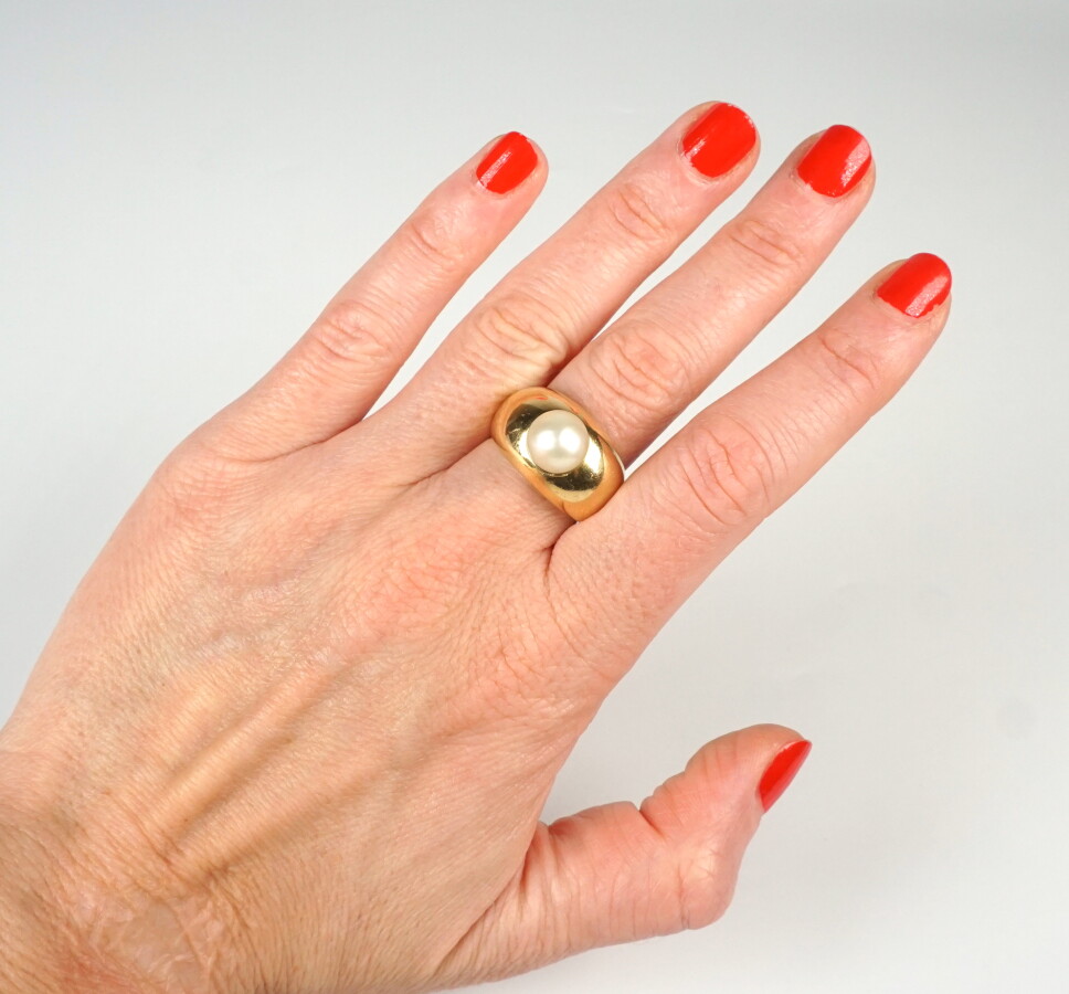 Bague "Dôme" en or jaune 18K (750/oo) sertie au centre d'une perle de culture 9 mm, Lar de la bague : 1.4 cm. TDD 58. Poids brut : 14.8 g environ.