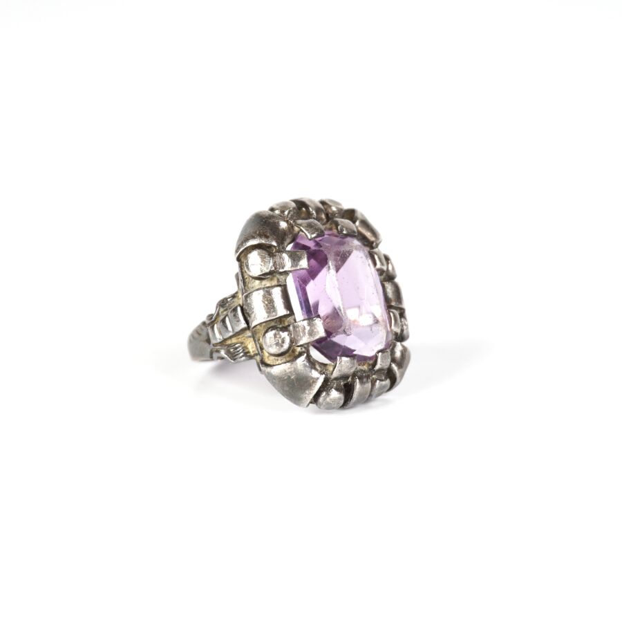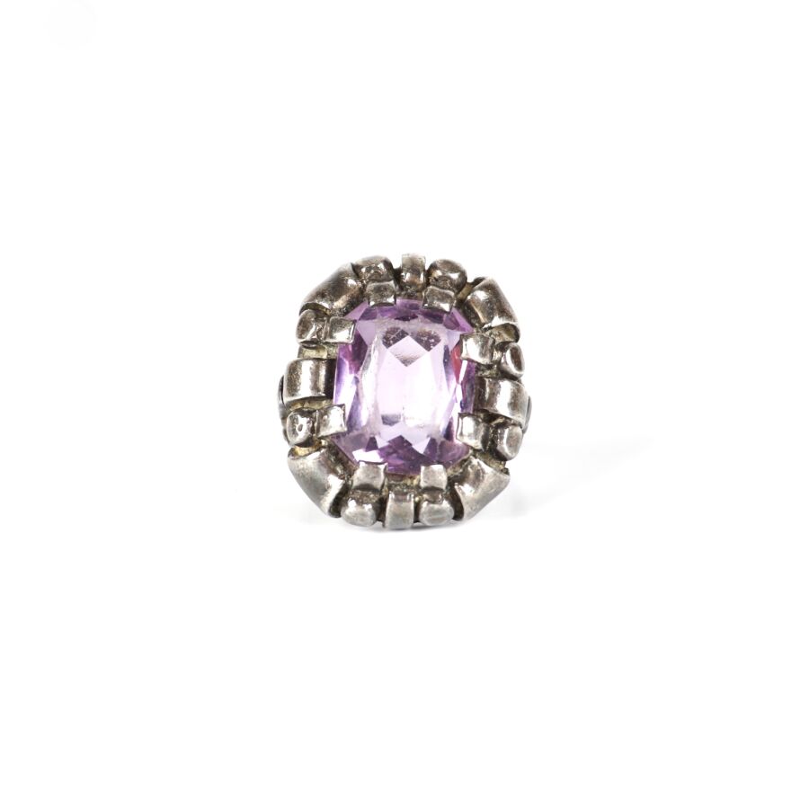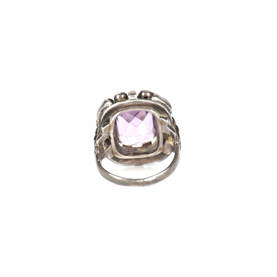 Bague en argent (800/oo) sertie au centre d'une améthyste facettée à pans coupés (Dim. 1.4 x 1.2 cm), l'entourage à décor de ferronneries, TDD. 54. Poids brut : 9.4 g environ (petites usures).