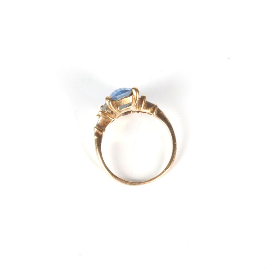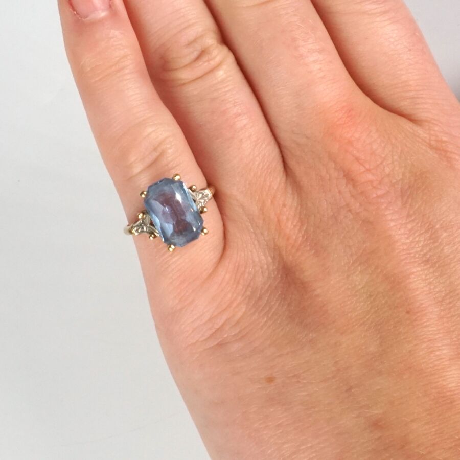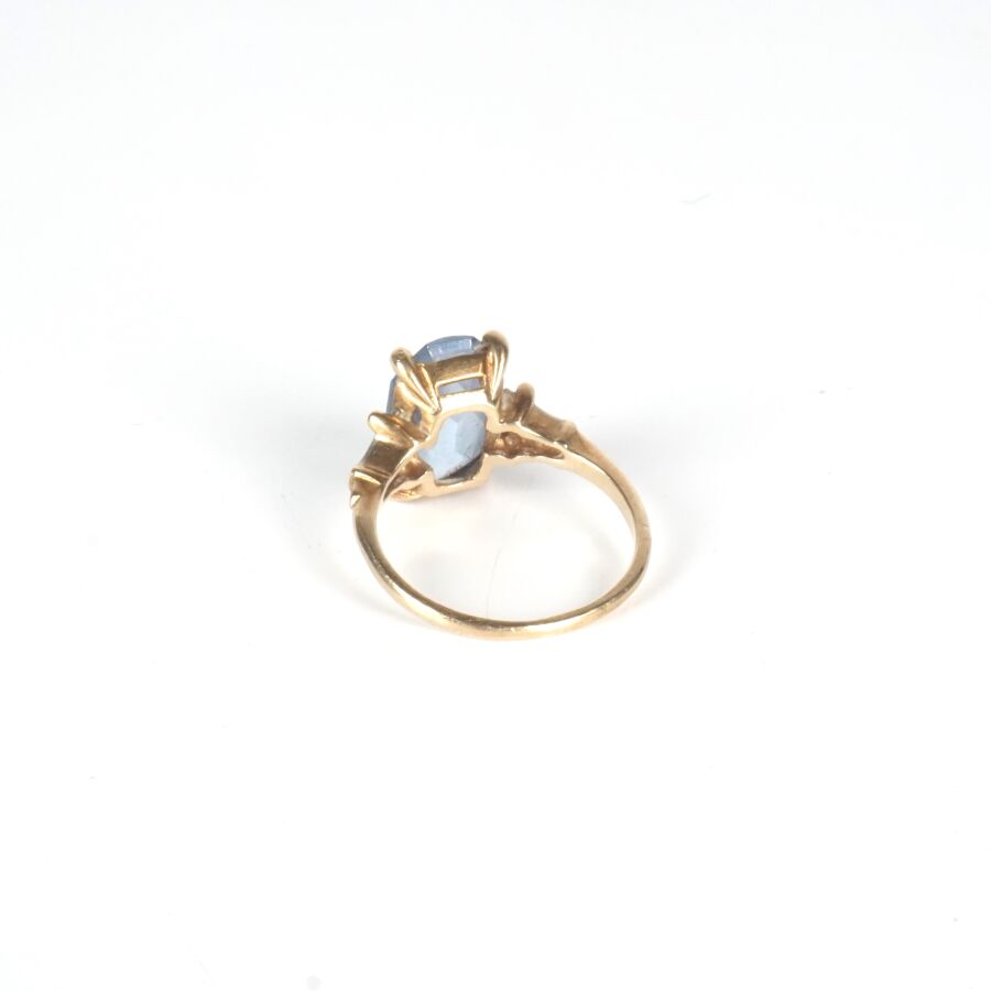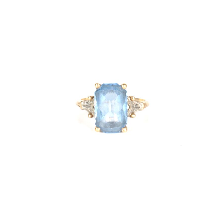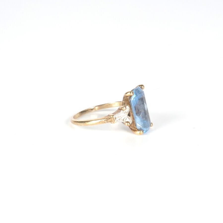 Bague en or 2 tons 14k (585/oo), sertie d'une topaze de taille émeraude (D. 1.2 x 0.8 cm), les montants à décor de noeuds, TDD. 51. Poids brut : 2.9 g environ.