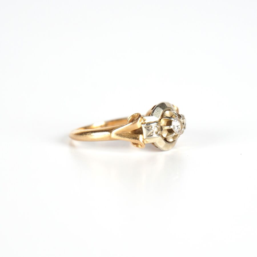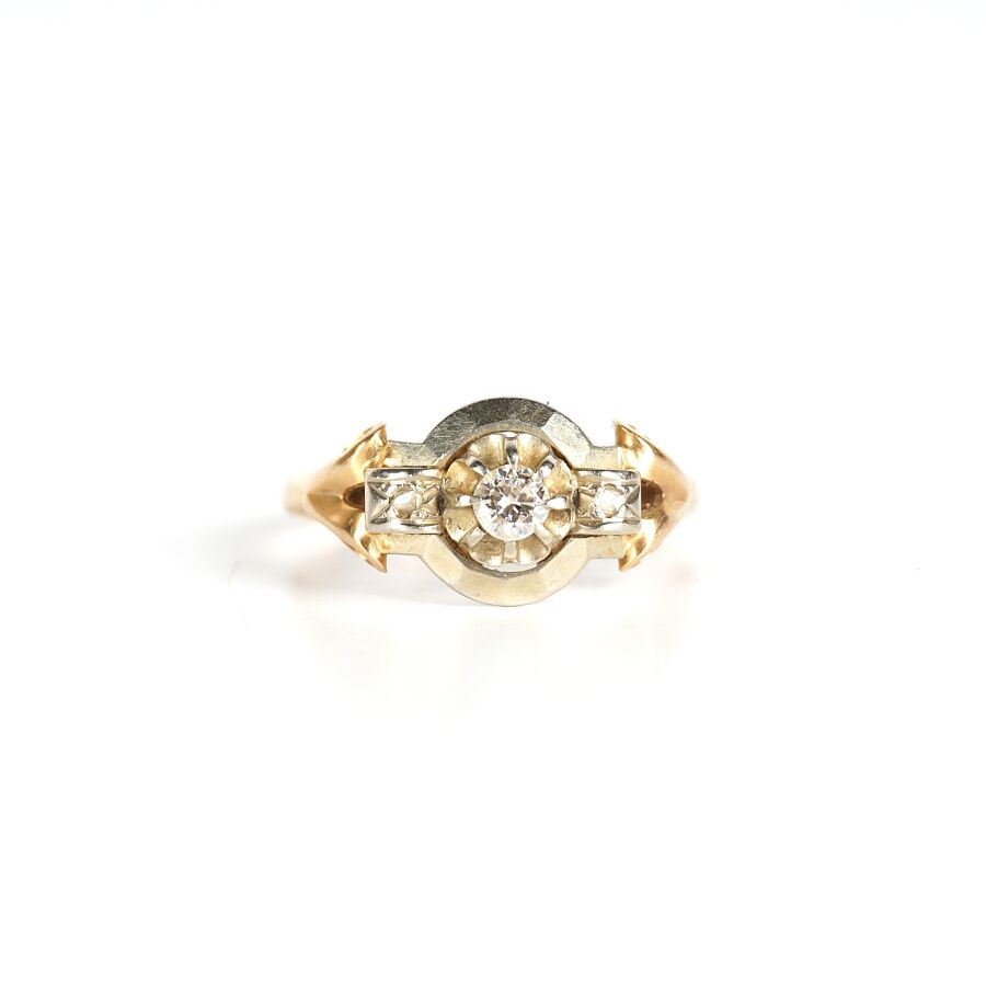 Bague en or 2 tons 18K (750/oo), serti 8 griffes d'un diamant taille brillant calibrant 0.1 cts environ (D. 3 mm) et épaulé de 2 petits diamants taille rose, TDD. 51. Dim. Tête de bague : 1.2 x 0.9 cm. Poids brut : 2.9 g environ.