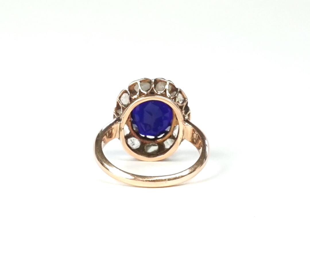 Bague en or 9K (375/oo) sertie au centre d'une pierre bleue taille ovale (12 x 10 mm), probablement une iolite ou une pierre de synthèse (petits éclats et égrisures), dans un entourage de 11 diamants taille rose. Dim du motif : 1.8 x 1.5 cm. TDD 55. Poids brut : 5.1 g environ.