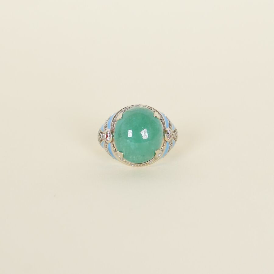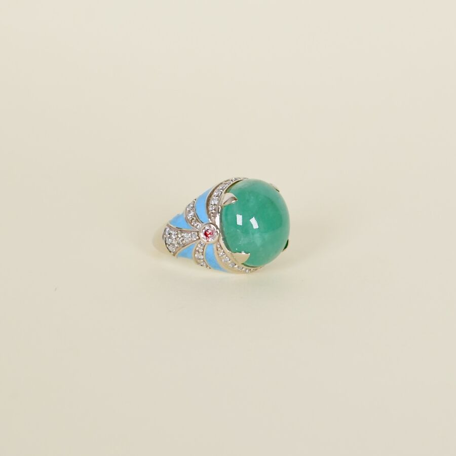 Bague en or blanc 14K (585/oo) ornée d'une belle émeraude taille cabochon en serti quatre griffe, calibrant 9.9 ct environ, l'anneau décoré d'un motif géométrique en émail bleuté et pavé de diamants pour un total d'environ 0.7 ct. Poids brut : 7.3 g environ.