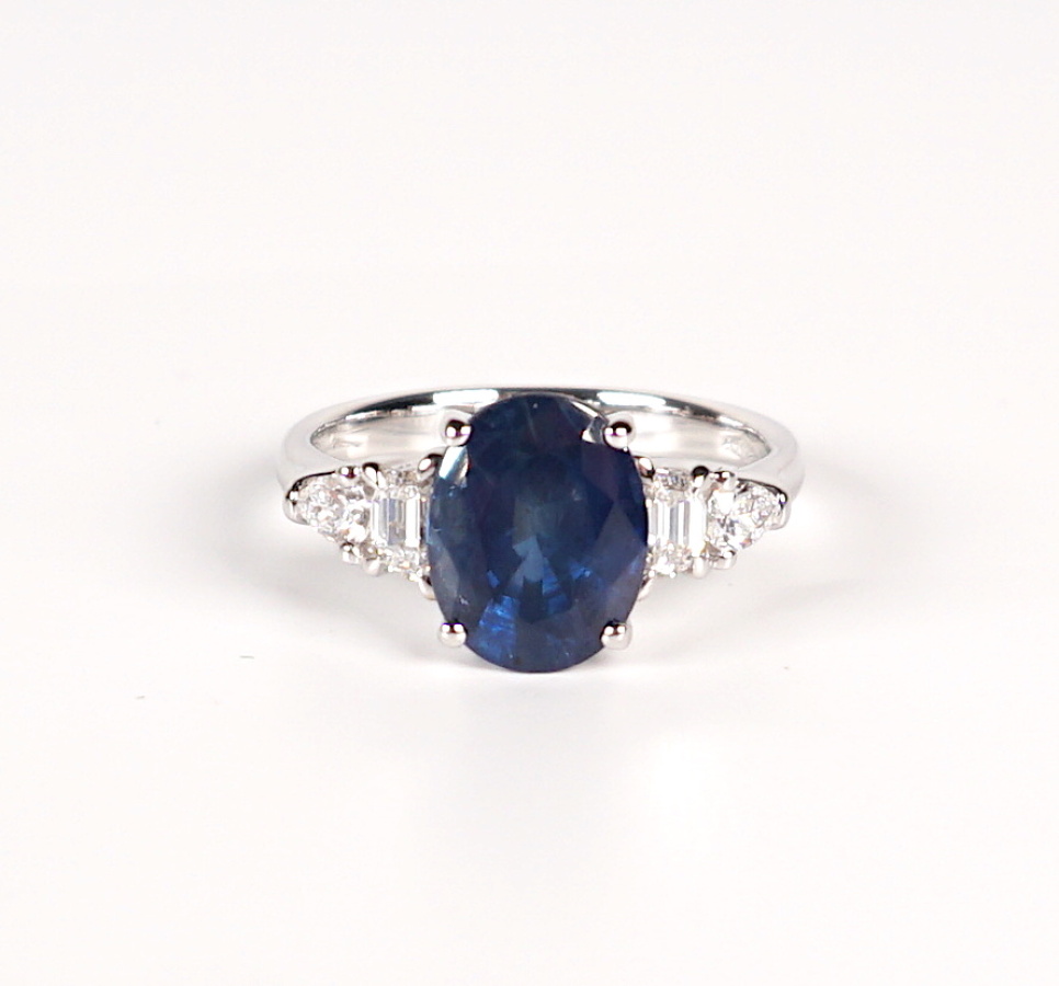 Bague en or blanc 18 K (750/oo) ornée d'un saphir de taille ovale 3.6 cts dans un entourage de 4 diamants pour 0.55 ct. TDD 54. Poids brut : 4.65 g environ.