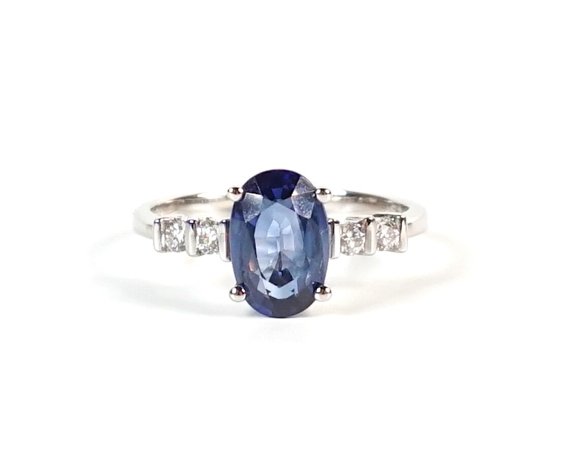 Bague en or blanc 18 K (750/oo) ornée d'un saphir taille ovale calibrant 2.1 cts épaulé de part et d'autre de 2 diamants ronds taille moderne pesant ensemble 0.15 ct. TDD 53. Poids brut : 3.05 g environ.