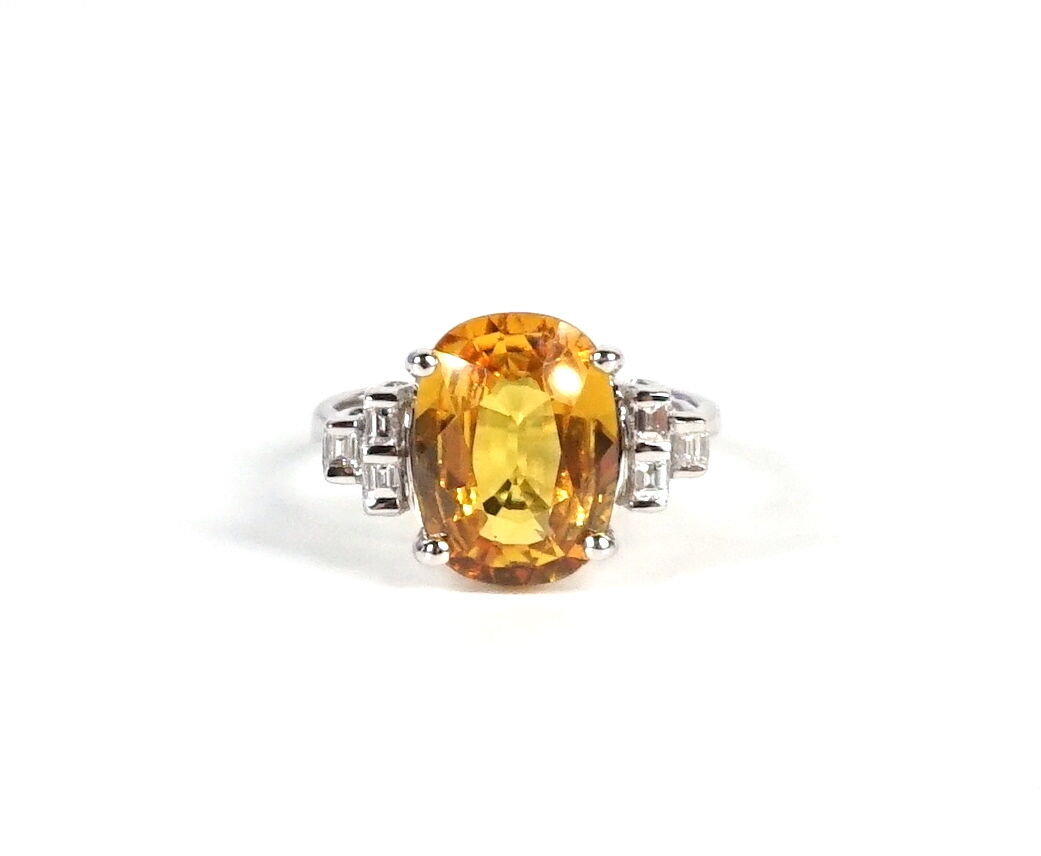 Bague en or blanc 18K (750/oo), ornée d'un important saphir jaune traité, calibrant 4.76 carats, épaulée de diamants taille baguettes pour 0.15 carat. TDD 54. Poids brut : 4.95 g environ.