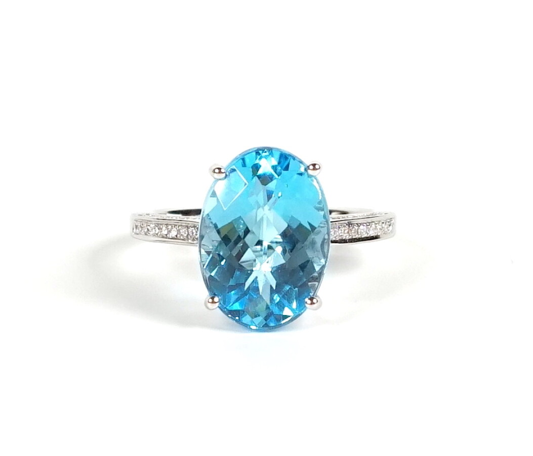 Bague en or blanc 18K (750/oo) ornée d'une importante topaze taille ovale calibrant 6.41 cts, l'anneau agrémenté de 44 diamants ronds pour 0.15 ct. TDD 55. Poids brut : 4.4 g environ.