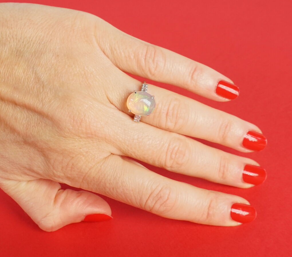 Bague en or blanc 18K (750/oo), sertie d'une opale taille cabochon pesant 3.05 carats épaulée de 6 diamants blancs taille baguette 0.10 carat. TDD 52.5. Poids brut : 3.3 g environ.