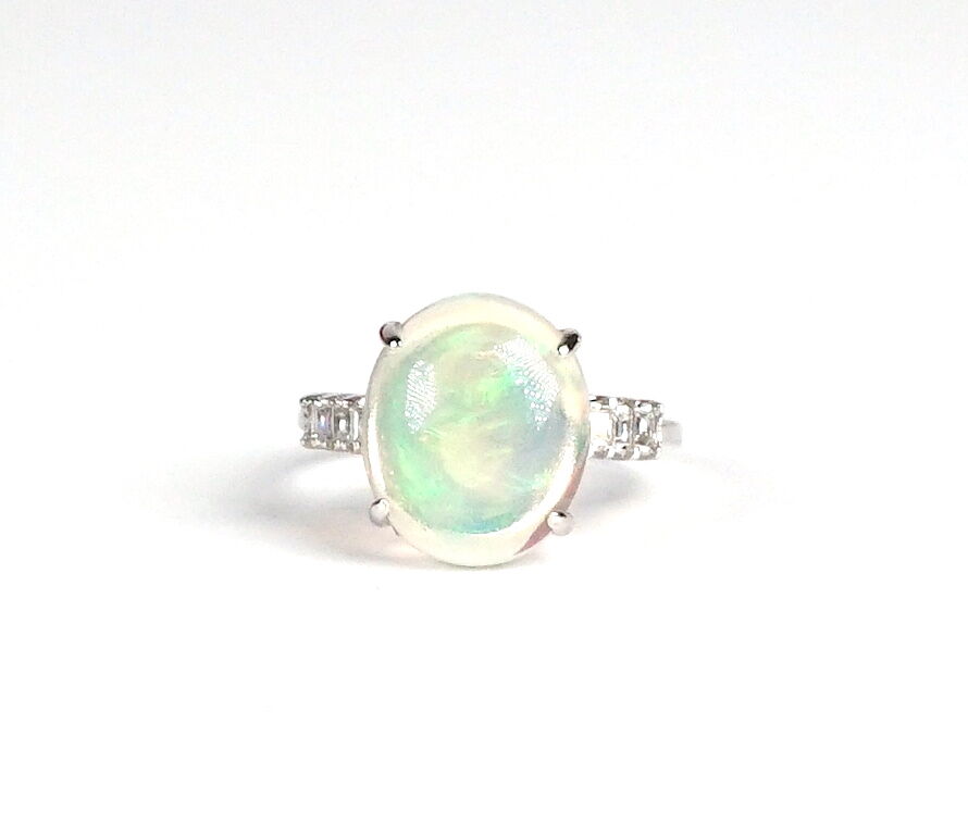 Bague en or blanc 18K (750/oo), sertie d'une opale taille cabochon pesant 3.05 carats épaulée de 6 diamants blancs taille baguette 0.10 carat. TDD 52.5. Poids brut : 3.3 g environ.