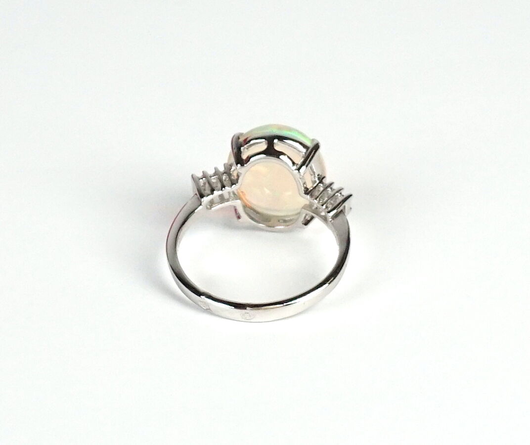 Bague en or blanc 18K (750/oo), sertie d'une opale taille cabochon pesant 3.05 carats épaulée de 6 diamants blancs taille baguette 0.10 carat. TDD 52.5. Poids brut : 3.3 g environ.