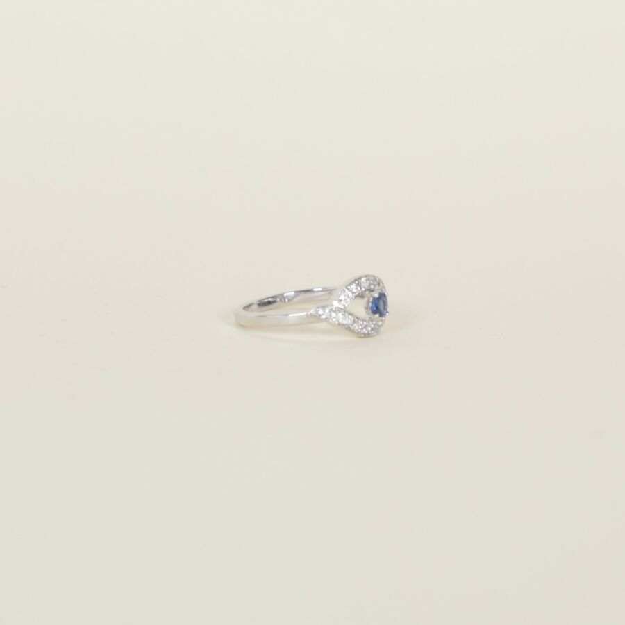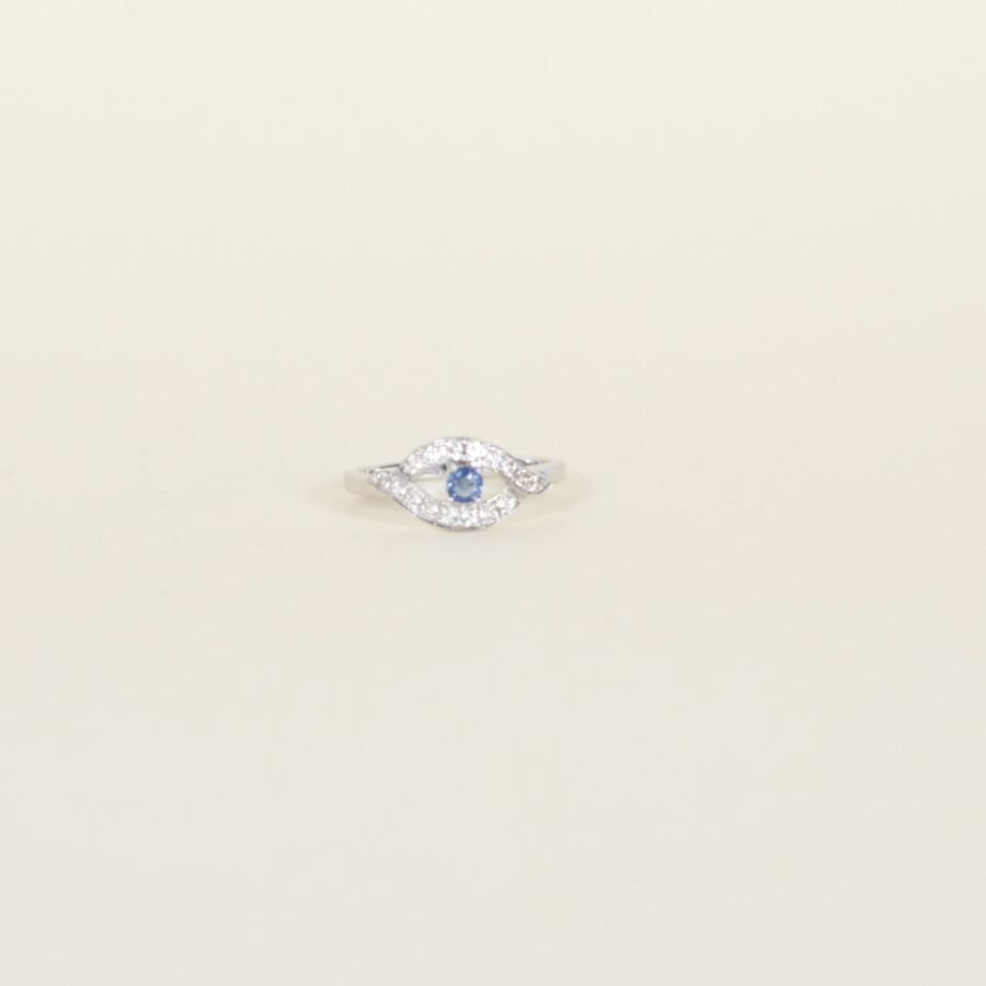 Bague en or blanc 9K (375/oo), ornée d'un saphir rond central calibrant 0.1 ct environ, dans un entourage de topazes blanches pour 0.2 ct environ, TDD : 52. Poids brut : 1.9 g environ.