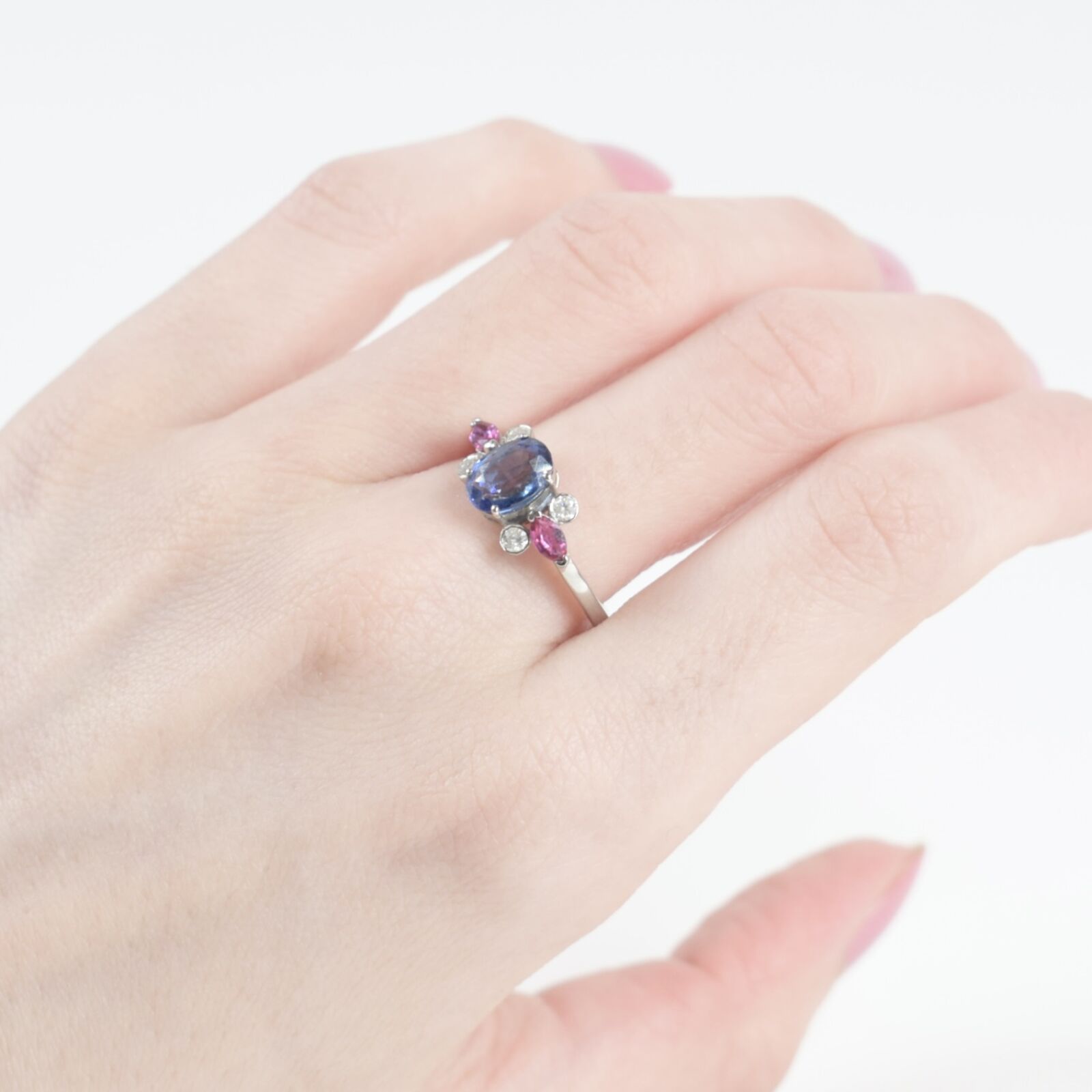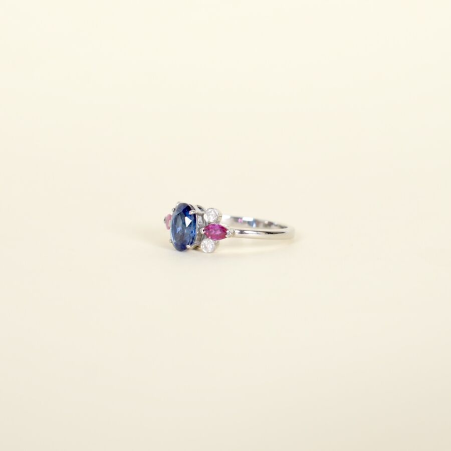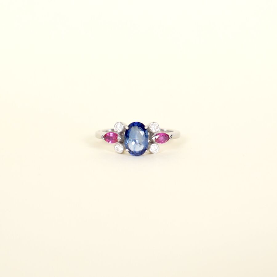 Bague en or blanc 9K (375/oo), ornée d'un saphir taille ovale calibrant 0.9 ct environ, épaulé de deux rubis taille marquise pour 0.3 ct environ et de quatre diamants ronds en serti clos pour 0.1 ct environ, Dim. Tête de bague : 7 x 6 x 5 mm. TDD : 54. Poids brut : 2.5 g environ.