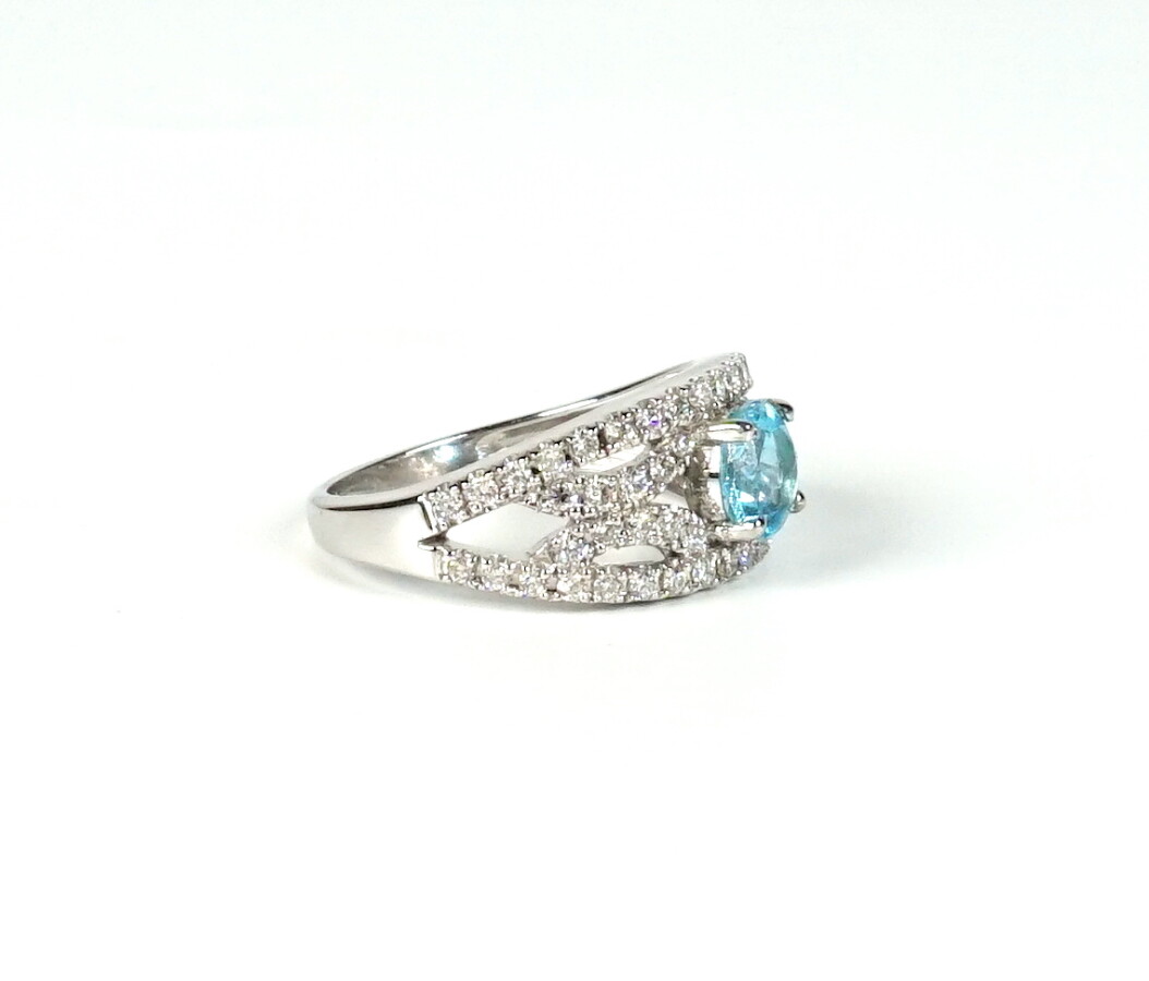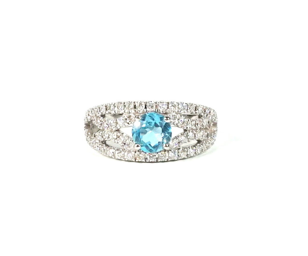 Bague en or blanc 9K (375/oo) ornée d'un topaze ronde dans un entourage ajouré serti de petits diamants, Lar. 0.9 cm. TDD 53. 3.3 g environ.
