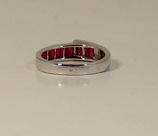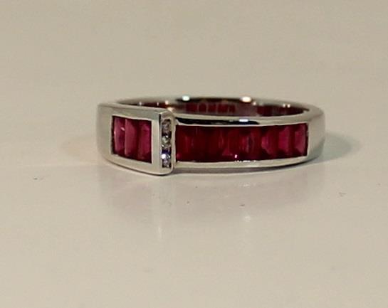 Bague en or blanc, sertie de 10 rubis (probablement Birman), taille calibré de 1.40 ct environ et de 3 diamants blancs taille moderne de 0.05 ct environ, TDD : 53.5. Poids brut : 3.7 g environ