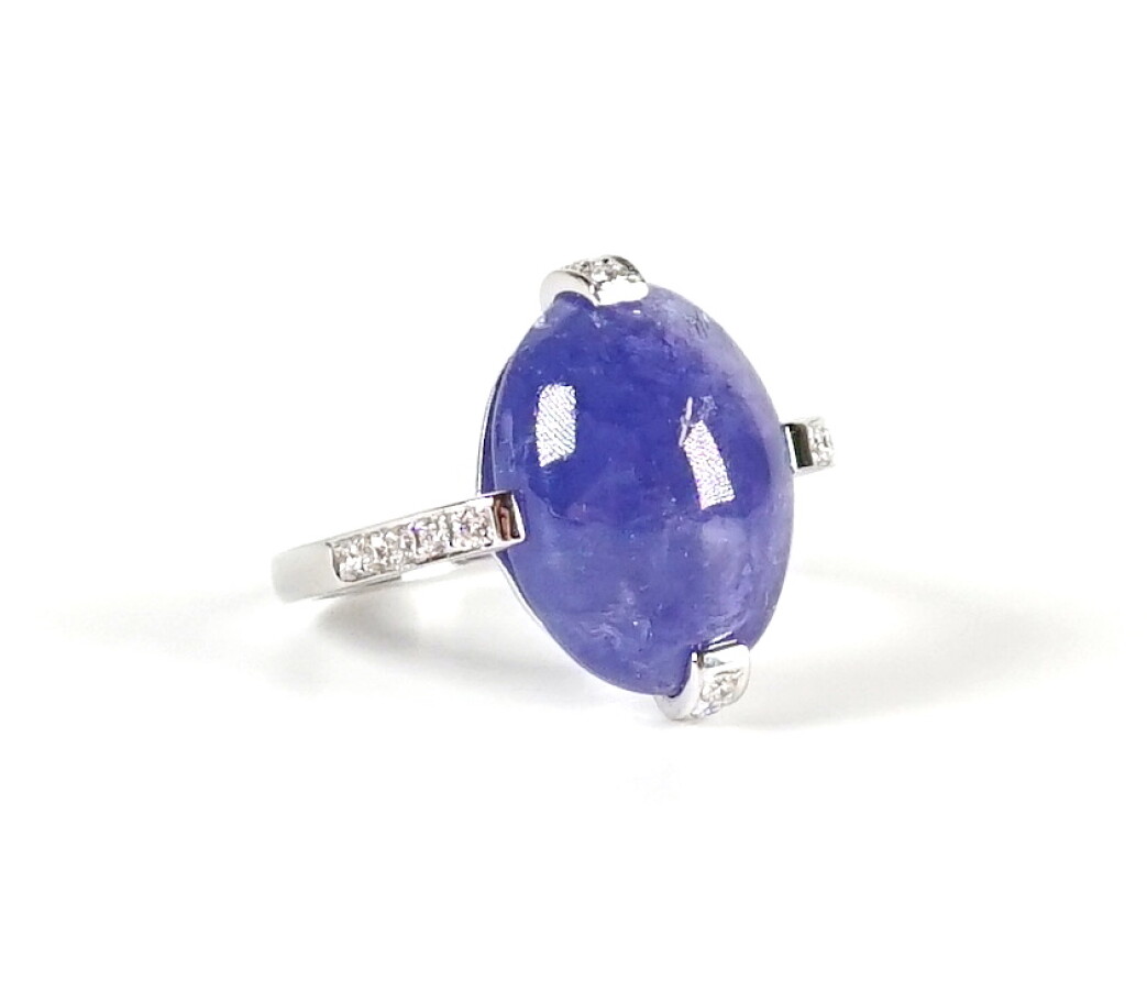 Bague en or gris 18K (750/oo) centrée d'un important cabochon ovale de tanzanite calibrant environ 11 carats, les quatre griffes serties de lignes de diamants taille brillant. TDD 53. Poids brut : 6,3 g.