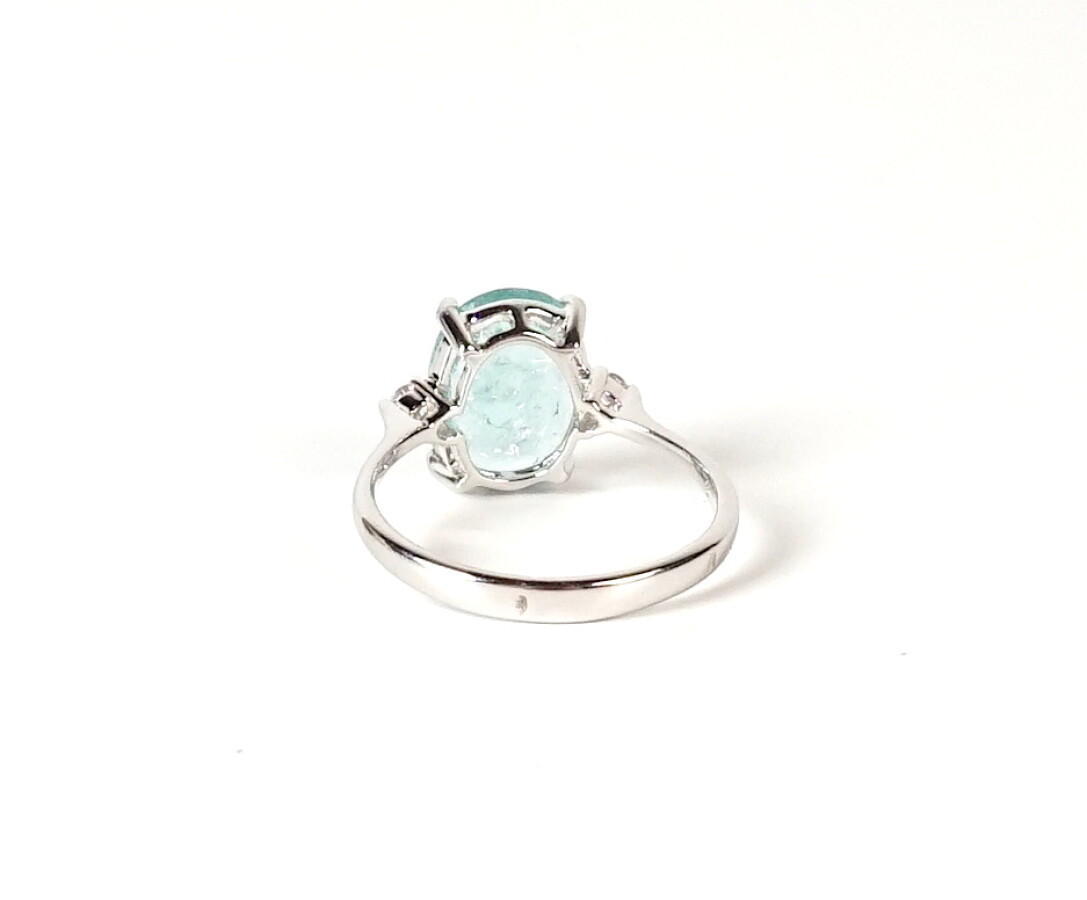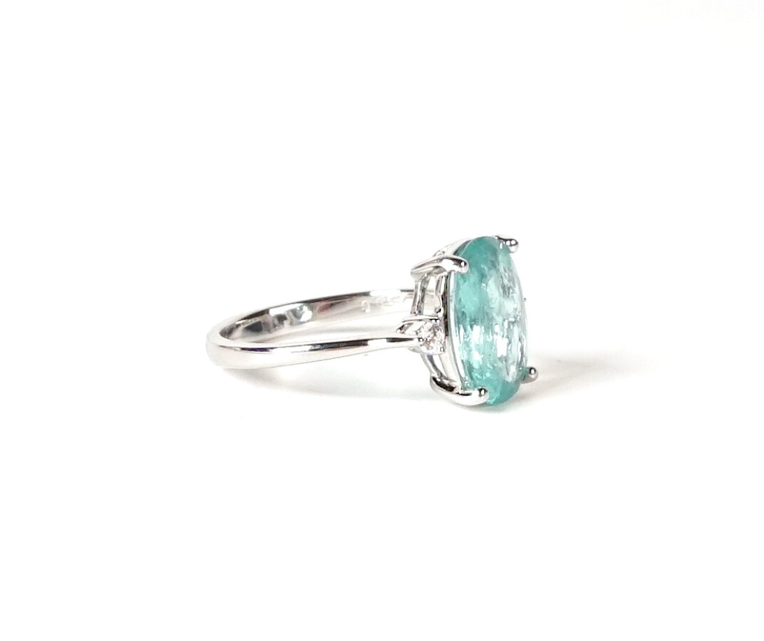 Bague en or gris 18K (750/oo) centrée d'une tourmaline Paraïba ovale calibrant 2,80 carats environ épaulée par deux diamants taille brillant. TDD 56. Poids brut : 3,3 g.