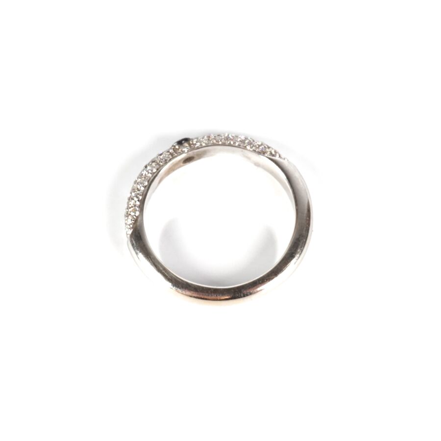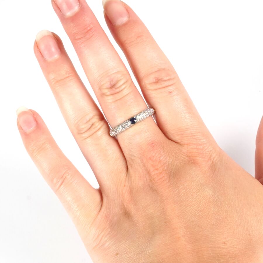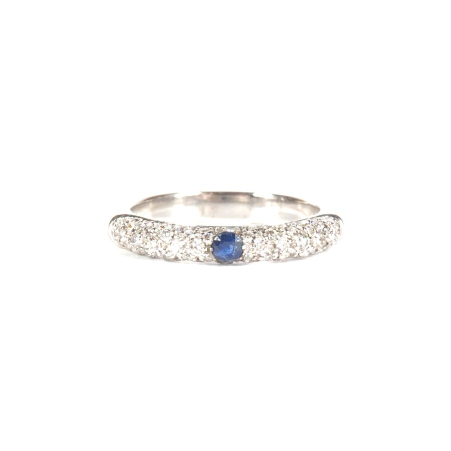 Bague en or gris 18K (750/oo), sertie au centre d'un saphir de couleur bleue calibrant 0.09 ct environ (D. 2.5 mm), dans un entourage de petits diamants, Larg. 3.5/4 mm. TDD. 58. Poids brut : 5.8 g environ.