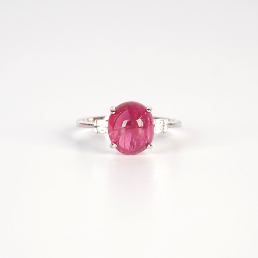 Bague en or gris 18K (750/oo) sertie d'un rubis traité, taillé en cabochon calibrant 4.5 ct environ, épaulé de 2x2 diamants taille baguette calibrant 0.10 ct environ, TDD. 54. Poids brut : 3 g environ.