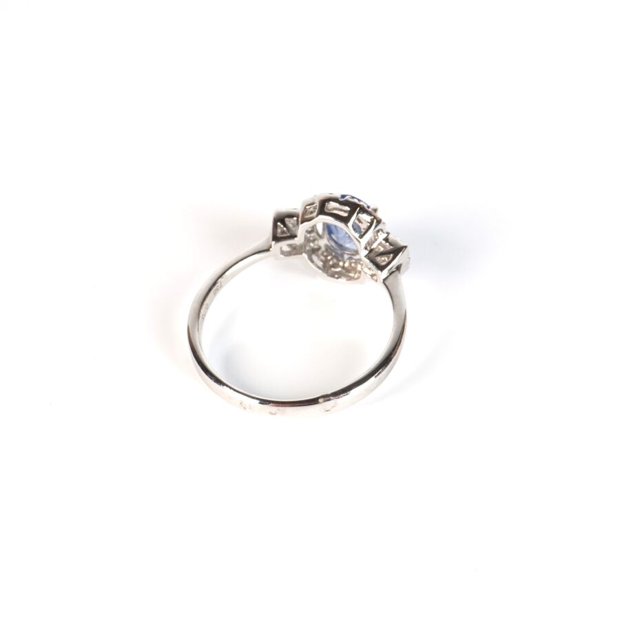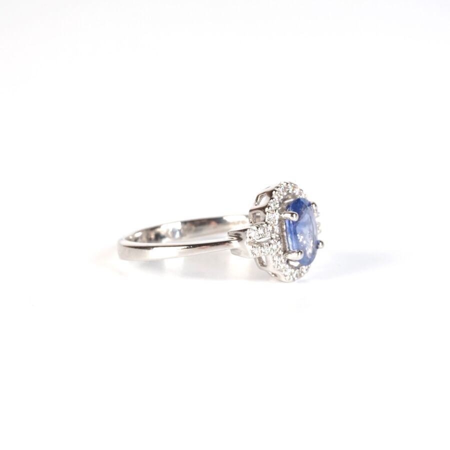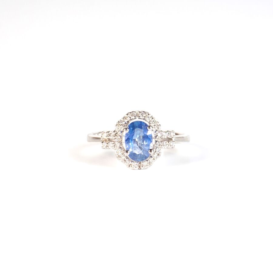 Bague en or gris 18K (750/oo) sertie d'un saphir de couleur bleu et de taille ovale calibrant 0.75 ct environ (7 x 5 mm) dans un entourage de 28 diamants blanc taille moderne calibrant ensemble 0.15 ct environ, TDD : 53. Dim. Tête de bague : 10 x 14 mm. Poids brut : 2.6 g environ.