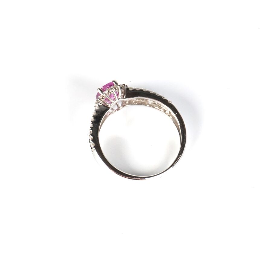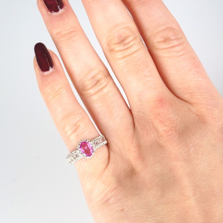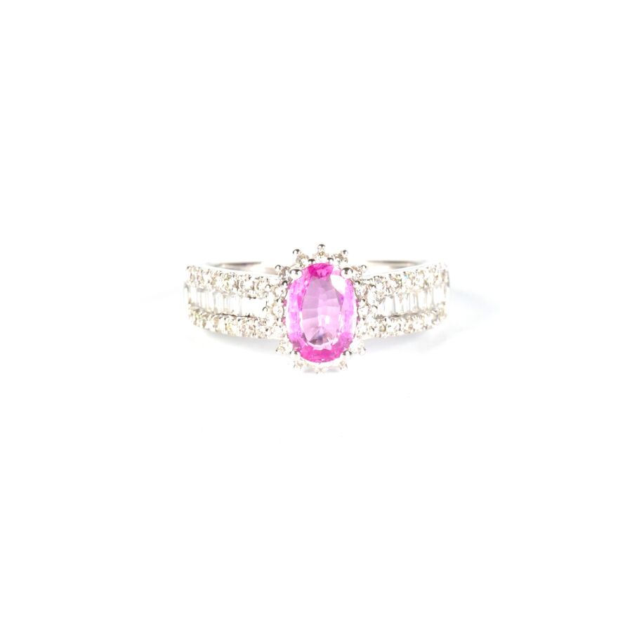 Bague en or gris 18K (750/oo) sertie d'un saphir rose de taille ovale calibrant 1 ct environ, dans un entourage de diamants taille moderne calibrant ensemble 0.40 ct environ, les montants de l'anneau sertis de diamants taille baguettes calibrant au total 0.15 carat environ, TDD. 51. Poids brut : 2.4 g environ.