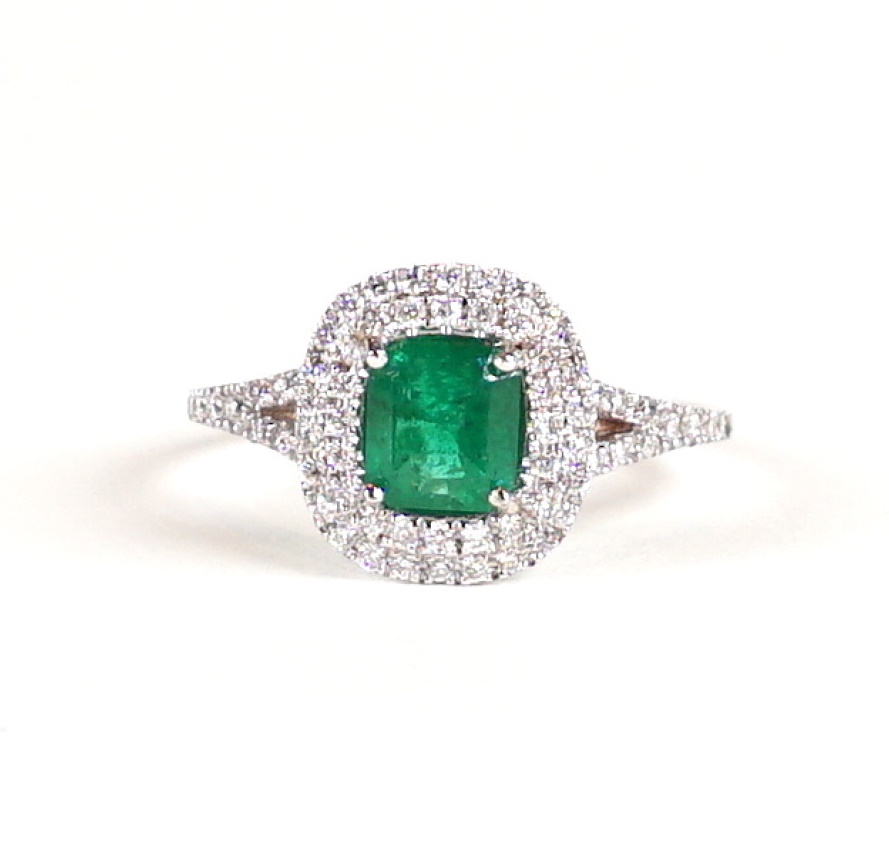 Bague en or gris 18K (750/oo) sertie d'une émeraude carrée à pans coupés calibrant 0,7 ct environ (origine probable Colombie), entourée et épaulé de diamants taille brillant. TDD 54. Poids brut : 2,38 g.