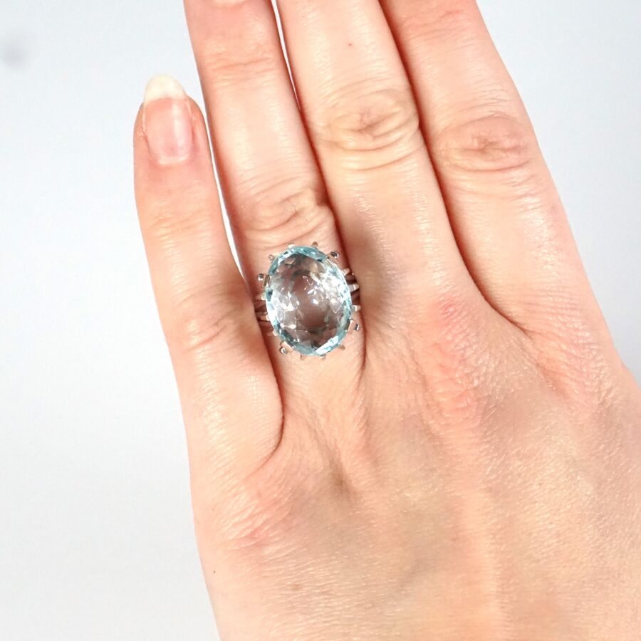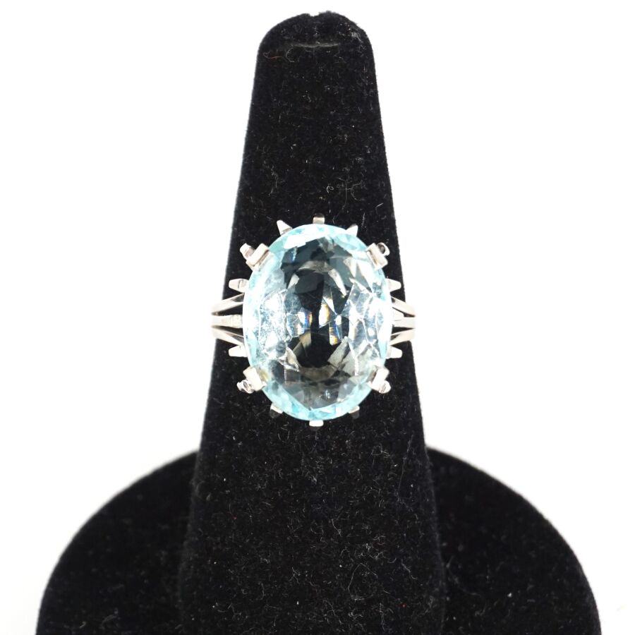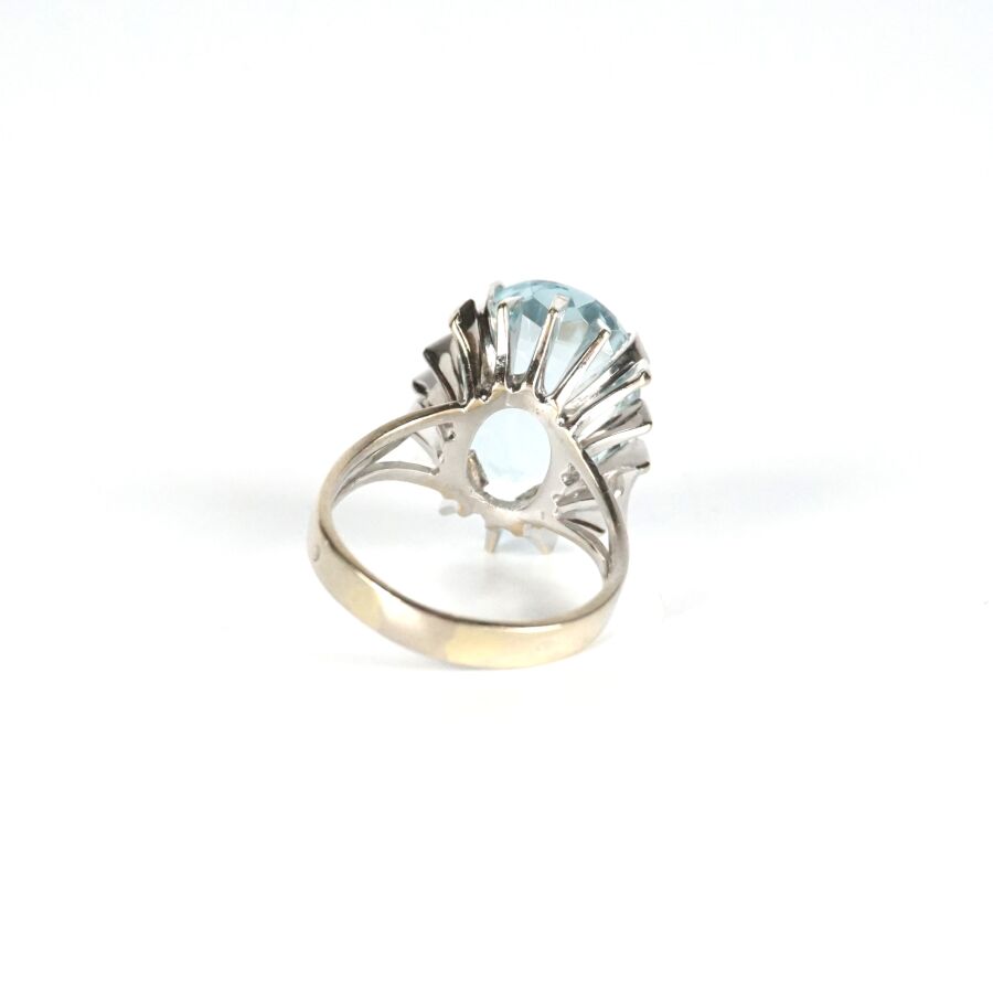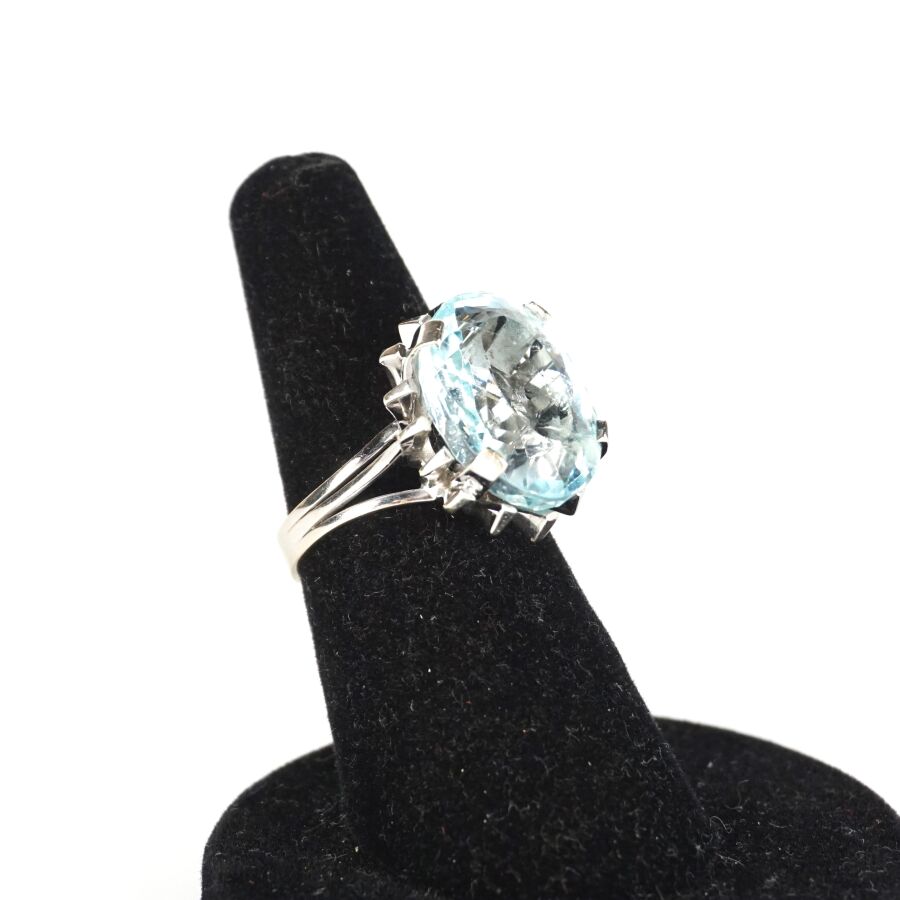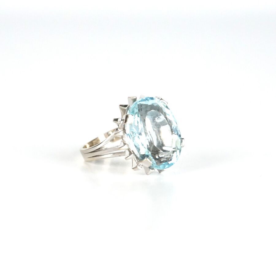Bague en or gris 18K (750/oo) sertie d'une importante aigue-marine facettée de forme ovale (Dim. 1.7 x 1.3 cm), montants triples, TDD. 55. Poids brut : 9.3 g environ.