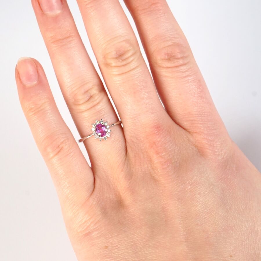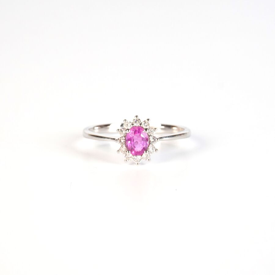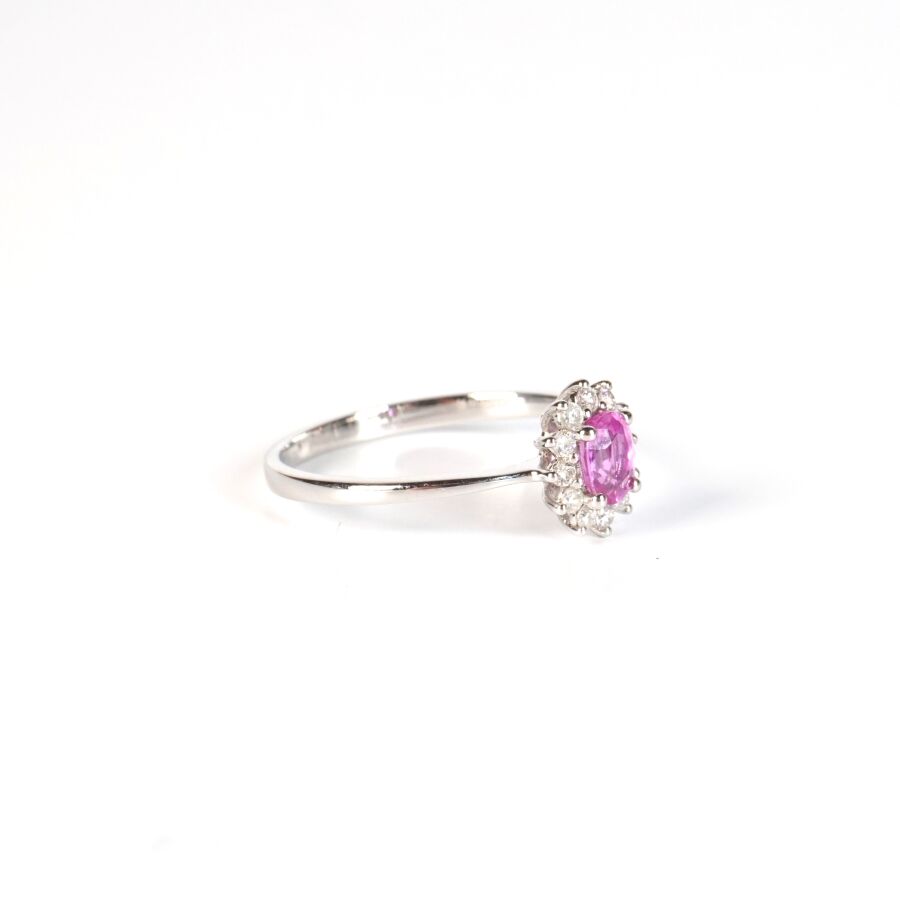 Bague en or gris 18K (750/oo), sertie en son centre d'un saphir de couleur rose, taille ovale, calibrant 0.55 ct environ (5 x 4 mm), entouré de 12 diamants taille moderne calibrant ensemble 0.18 ct environ, TDD : 56.5. Dim. Tête de bague : 8 x 9 mm. Poids brut : 1.9 g environ.