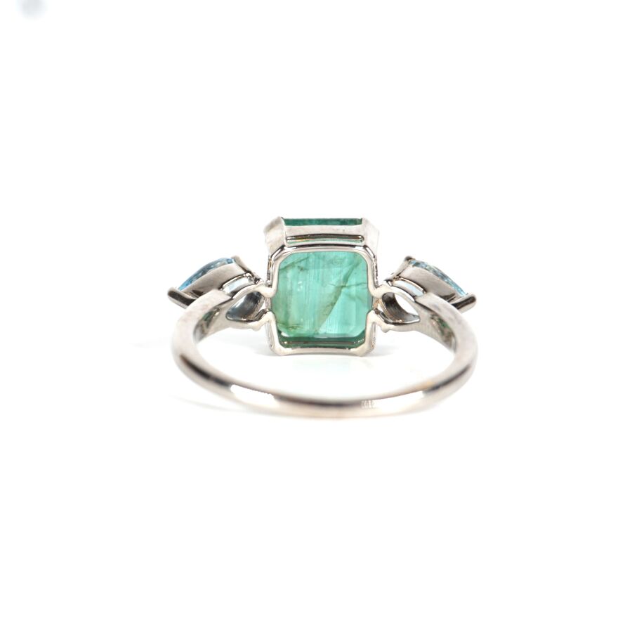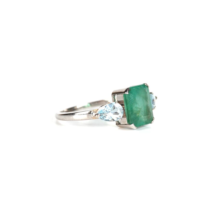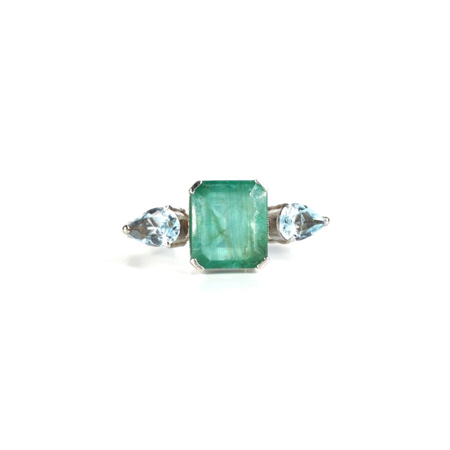 Bague en or gris 9K (375/oo), sertie d'une émeraude taille coussin mixte calibrant 2.6 cts environ (D. 9 x 8 mm) épaulée de deux aigues-marines taille poire calibrant ensemble 0.6 cts environ, TDD. 56. Poids brut : 2.7 g environ (petit éclat sous la pierre).