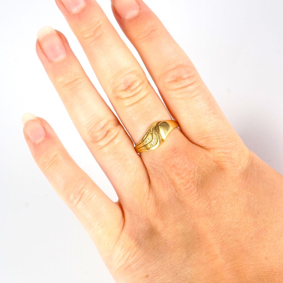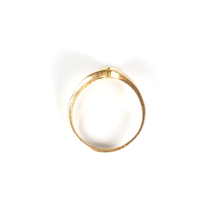 Bague en or jaune 14K (585/oo), motif torsadé serti de 5 petits diamants ronds, Larg. 8 mm. TDD. 59.5. Poids brut : 3.2 g environ.