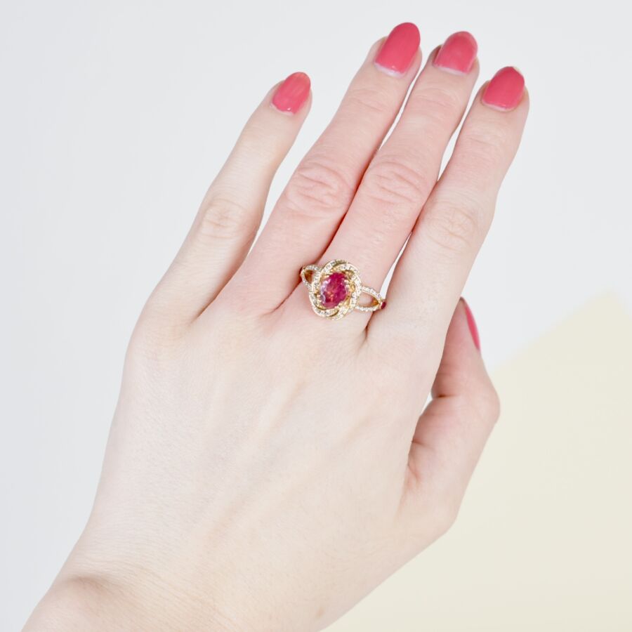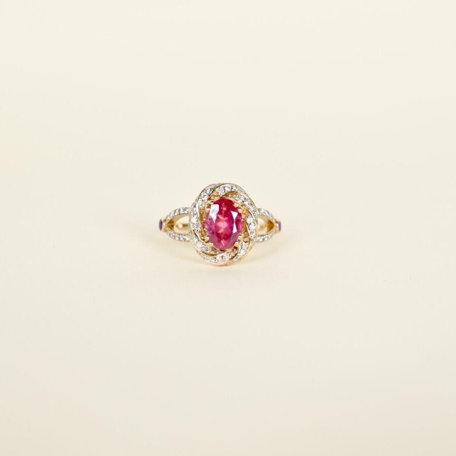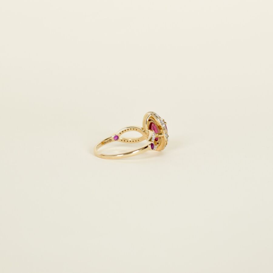 Bague en or jaune 14K (585/oo), sertie en son centre d'une tourmaline de couleur rose, taille ovale, calibrant 1.6 ct environ, entourée d'un double halo diamanté s'achevant sur deux rubis calibrant ensemble 0.3 ct environ. Poids brut : 4.4 g environ.