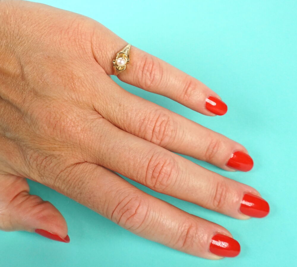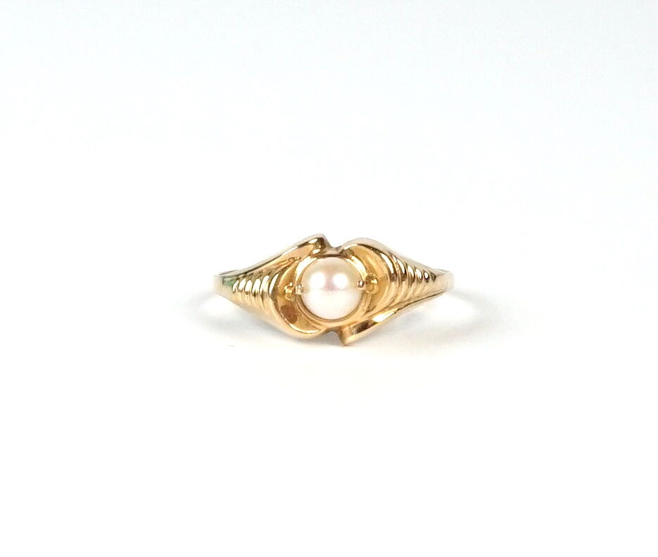 Bague en or jaune 18K (750/oo), à décor godronné et sertie d'une petite perle 3 mm. TDD 49. Poids brut : 1 g environ