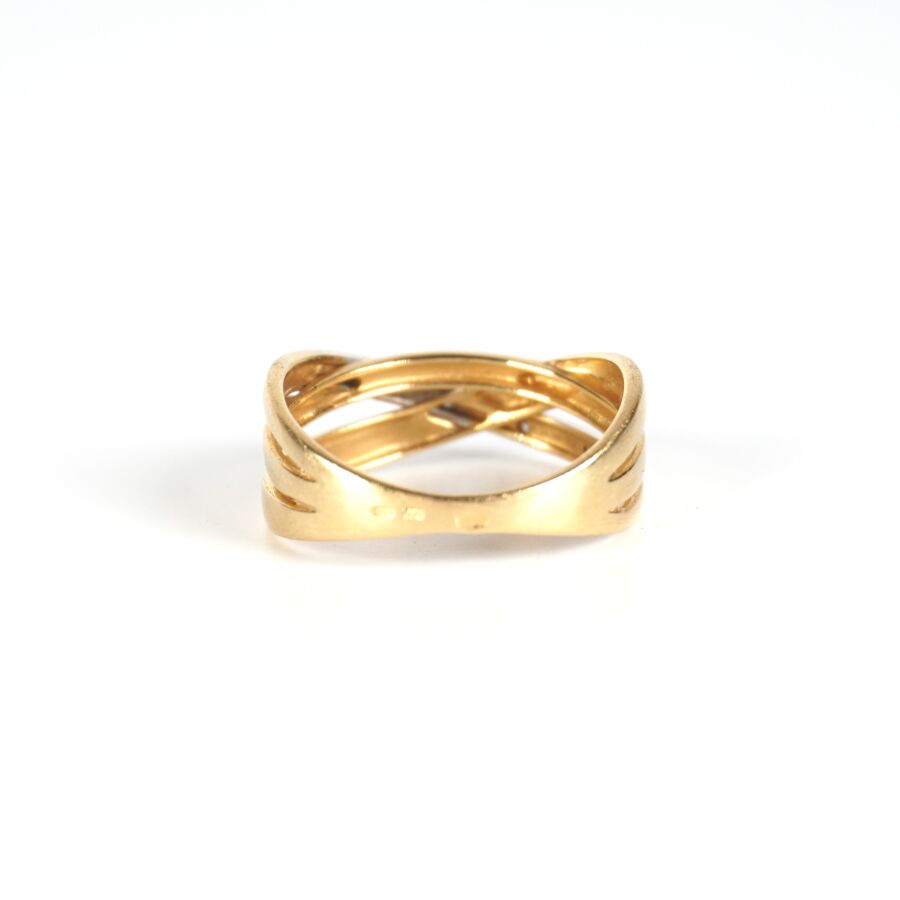 Bague en or jaune 18K (750/oo) à motif de trois anneaux entrecroisés, l'un serti de 5 petits diamants taille brillant, TDD. 52. Larg. 7 mm. Poids brut : 3 g environ.