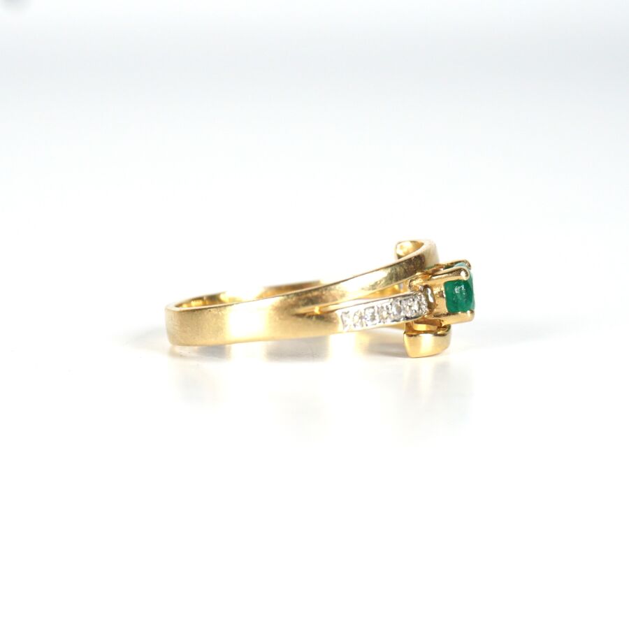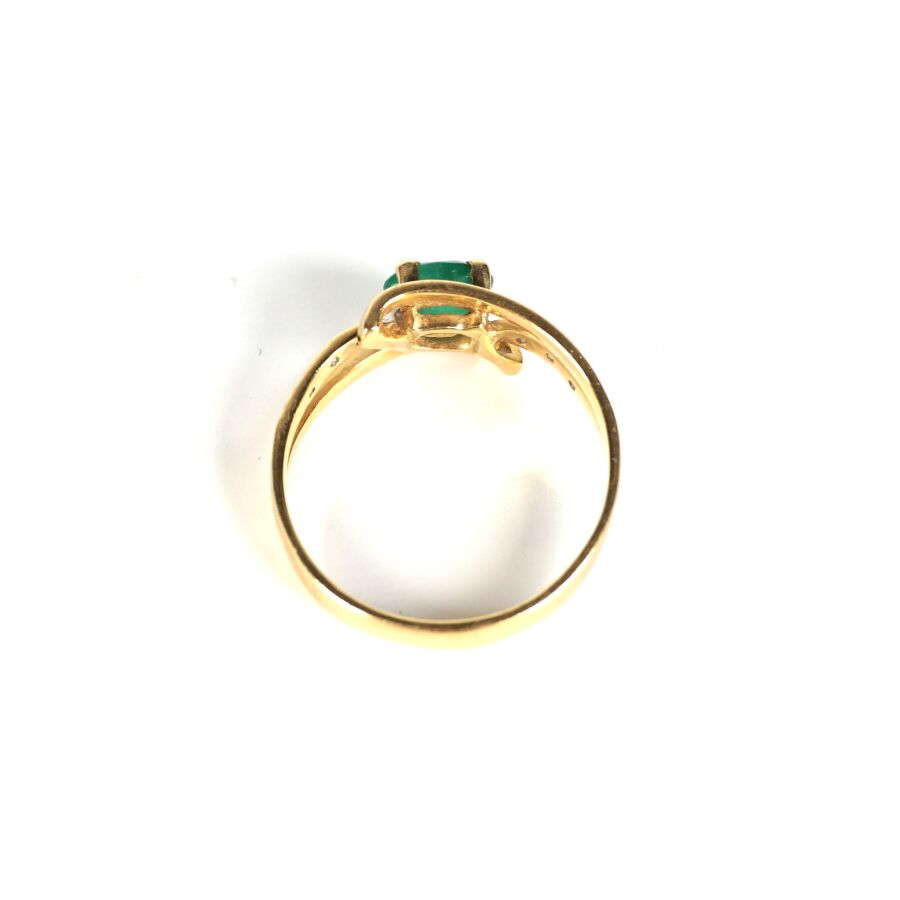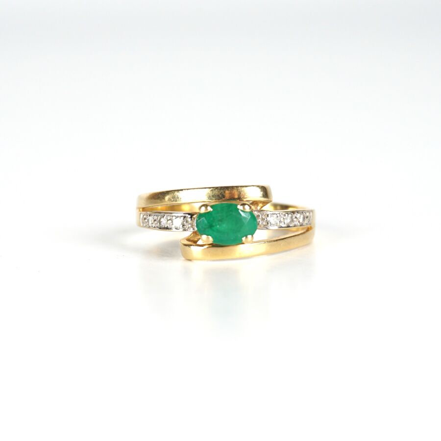 Bague en or jaune 18K (750/oo) à motif de trois lignes, la ligne centrale sertie quatre griffes d'une émeraude taille ovale (D.7 x 4 mm) entourée de 2x3 petits diamants, TDD. 54.5. Larg. 7 mm. Poids brut : 2.9 g environ.
