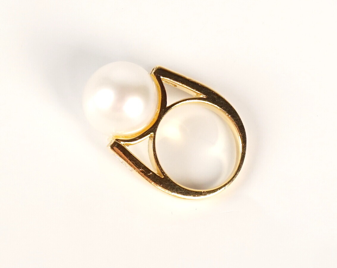 Bague en or jaune 18K (750/oo) centrée d'une importante perle de culture (diamètre 14,9 mm environ), les attaches serties de diamants taille princesse. TDD 51,5. Poids brut : 12 g.